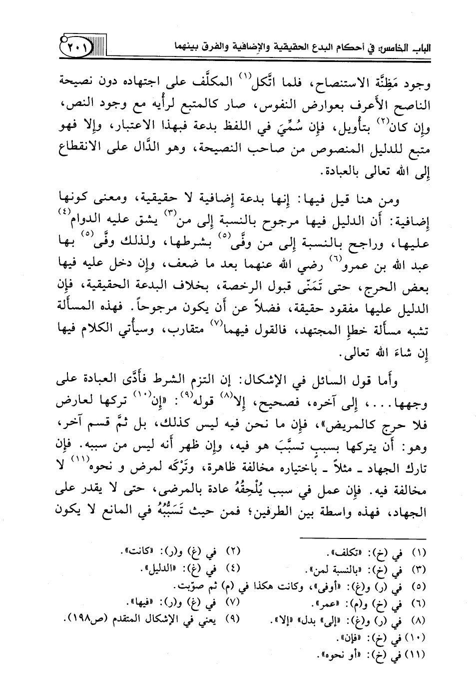 وَمِنْ هُنَا قِيلَ فِيهَا: إِنها بِدْعَةٌ إِضافية لَا حَقِيقِيَّةٌ، وَمَعْنَى كَوْنِهَا إِضافية: أَن الدَّلِيلَ فِيهَا مَرْجُوحٌ بِالنِّسْبَةِ إِلى من (¬3) يَشُقُّ عَلَيْهِ الدَّوَامُ (¬4) عَلَيْهَا، وَرَاجِحٌ بِالنِّسْبَةِ إِلى مَنْ وفَّى (¬5) بِشَرْطِهَا، وَلِذَلِكَ وفَّى (5) بِهَا عَبْدُ الله بن عمرو (¬6) رضي الله عنهما بعد ما ضَعُفَ، وإِن دَخَلَ عَلَيْهِ فِيهَا بَعْضُ الْحَرَجِ، حَتَّى تَمَنّى قَبُولَ الرُّخْصَةِ، بِخِلَافِ الْبِدْعَةِ الْحَقِيقِيَّةِ، فإِن الدَّلِيلَ عَلَيْهَا مَفْقُودٌ حَقِيقَةً، فَضْلًا عَنْ أَن يَكُونَ مَرْجُوحًا. فَهَذِهِ المسأَلة تُشْبِهُ مسأَلة خطإِ الْمُجْتَهِدِ، فَالْقَوْلُ فِيهِمَا (¬7) مُتَقَارِبٌ، وسيأْتي الْكَلَامُ فيها إِن شاءَ اللَّهُ تَعَالَى.