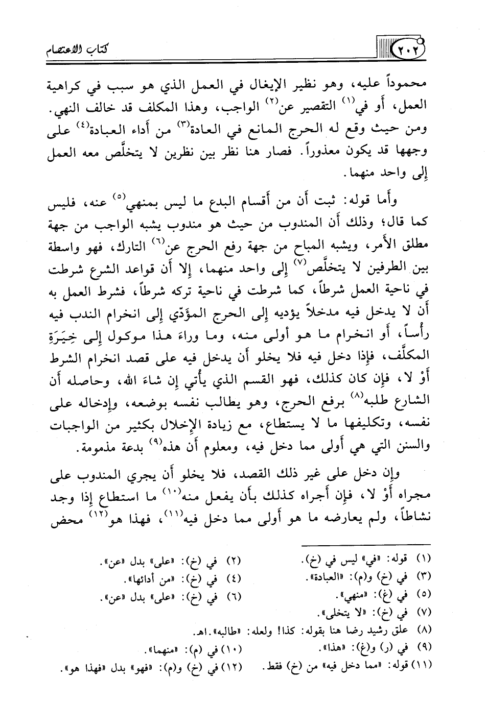 وأَما قَوْلُهُ: ثَبَتَ أَن مِنْ أَقسام الْبِدَعِ مَا لَيْسَ بِمَنْهِيٍّ (¬5) عَنْهُ، فليس كما قال؛ وذلك أَن المندوب مِنْ حَيْثُ هُوَ مَنْدُوبٌ يُشْبِهُ الْوَاجِبَ مِنْ جِهَةِ مُطْلَقِ الأَمر، وَيُشْبِهُ الْمُبَاحَ مِنْ جِهَةِ رفع الحرج عن (¬6) التارك، فهو واسطة بين الطرفين لا يتخلَّص (¬7) إِلى وَاحِدٍ مِنْهُمَا، إِلا أَن قَوَاعِدَ الشَّرْعِ شَرَطَتْ فِي نَاحِيَةِ الْعَمَلِ شَرْطًا، كَمَا شَرَطَتْ فِي نَاحِيَةِ تَرْكِهِ شَرْطًا، فَشَرْطُ الْعَمَلِ بِهِ أَن لَا يَدْخُلَ فِيهِ مُدْخَلًا يُؤَدِّيهِ إِلى الْحَرَجِ المؤَدّي إِلى انْخِرَامِ النَّدْبِ فِيهِ رأْساً، أَو انْخِرَامِ مَا هُوَ أَوْلَى مِنْهُ، وَمَا وراءَ هَذَا مَوْكُولٌ إِلى خِيَرَةِ المكلَّف، فإِذا دَخَلَ فِيهِ فَلَا يَخْلُو أَن يَدْخُلَ فِيهِ عَلَى قَصْدِ انْخِرَامِ الشَّرْطِ أَوْ لَا، فإِن كَانَ كَذَلِكَ، فَهُوَ الْقِسْمُ الَّذِي يأْتي إِن شاءَ الله، وحاصله أَن الشارع طلبه (¬8) بِرَفْعِ الْحَرَجِ، وَهُوَ يُطَالِبُ نَفْسَهُ بِوَضْعِهِ، وإِدخاله عَلَى نَفْسِهِ، وَتَكْلِيفِهَا مَا لَا يُسْتَطَاعُ، مَعَ زِيَادَةِ الإِخلال بِكَثِيرٍ مِنَ الْوَاجِبَاتِ وَالسُّنَنِ الَّتِي هِيَ أَولى مِمَّا دَخَلَ فِيهِ، وَمَعْلُومٌ أَن هَذِهِ (¬9) بِدْعَةٌ مَذْمُومَةٌ.