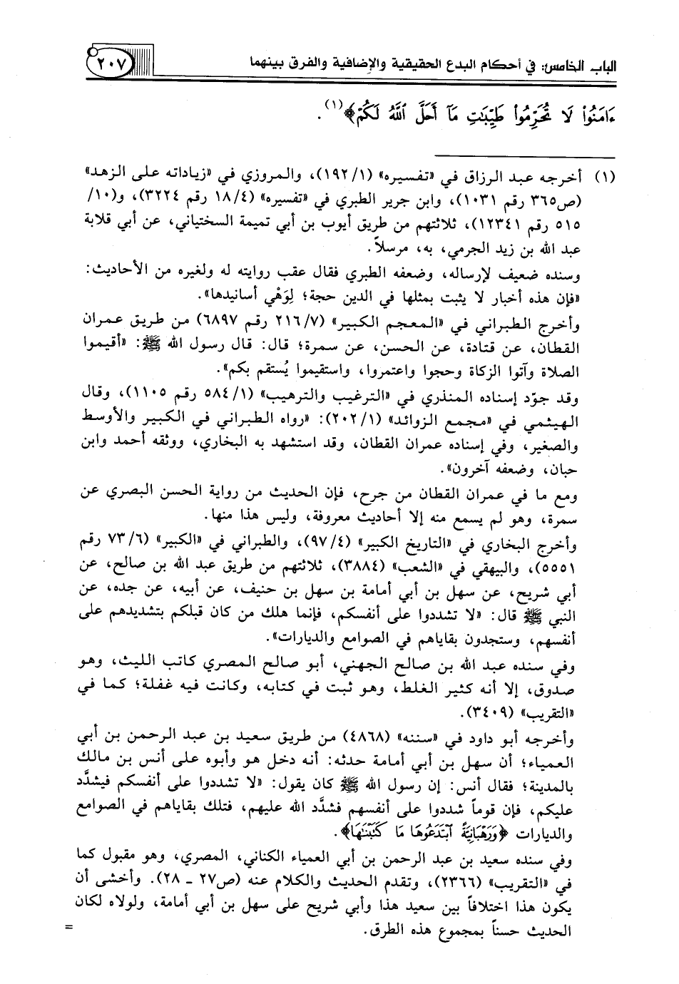 وأخرج البخاري في "التاريخ الكبير" (4/ 97)، والطبراني في "الكبير" (6/ 73 رقم 5551)، والبيهقي في "الشعب" (3884)، ثلاثتهم من طريق عبد الله بن صالح، عن أبي شريح، عن سهل بن أبي أمامة بن سهل بن حنيف، عن أبيه، عن جده، عن النبي صلّى الله عليه وسلّم قال: "لا تشددوا على أنفسكم، فإنما هلك من كان قبلكم بتشديدهم على أنفسهم، وستجدون بقاياهم في الصوامع والديارات".
