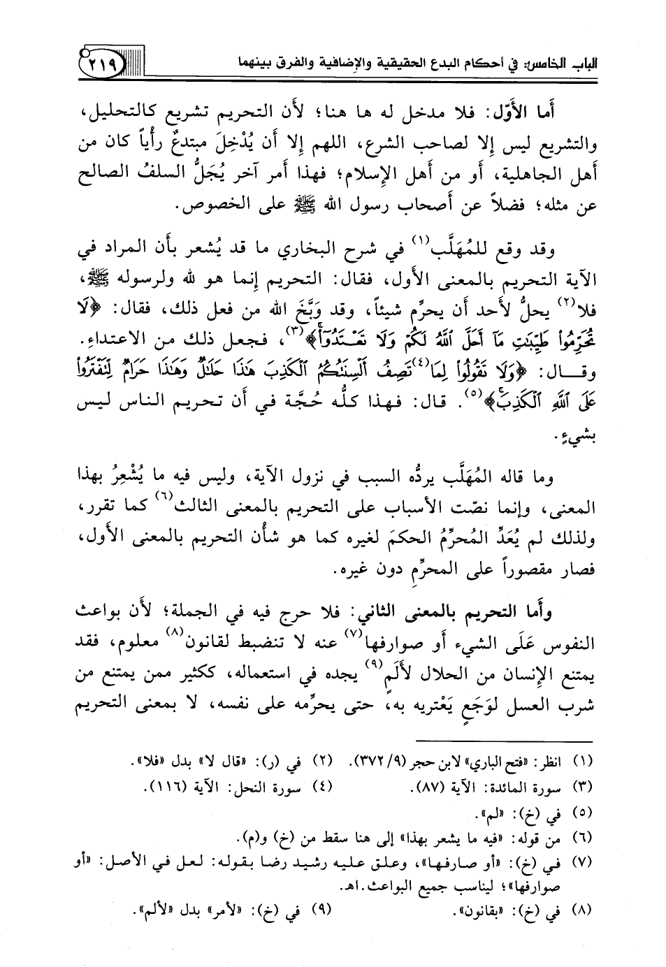 أَما الأَوّل: فلا مدخل له ها هنا؛ لأَن التَّحْرِيمَ تَشْرِيعٌ كَالتَّحْلِيلِ، وَالتَّشْرِيعُ لَيْسَ إِلا لِصَاحِبِ الشَّرْعِ، اللَّهُمَّ إِلا أَن يُدْخِلَ مبتدعٌ رأْياً كَانَ مِنْ أَهل الْجَاهِلِيَّةِ، أَو مِنْ أَهل الإِسلام؛ فَهَذَا أَمر آخَرُ يُجَلُّ السلفُ الصَّالِحُ عَنْ مِثْلِهِ؛ فَضْلًا عَنْ أَصحاب رَسُولِ اللَّهِ صَلَّى اللَّهُ عَلَيْهِ وَسَلَّمَ عَلَى الْخُصُوصِ.