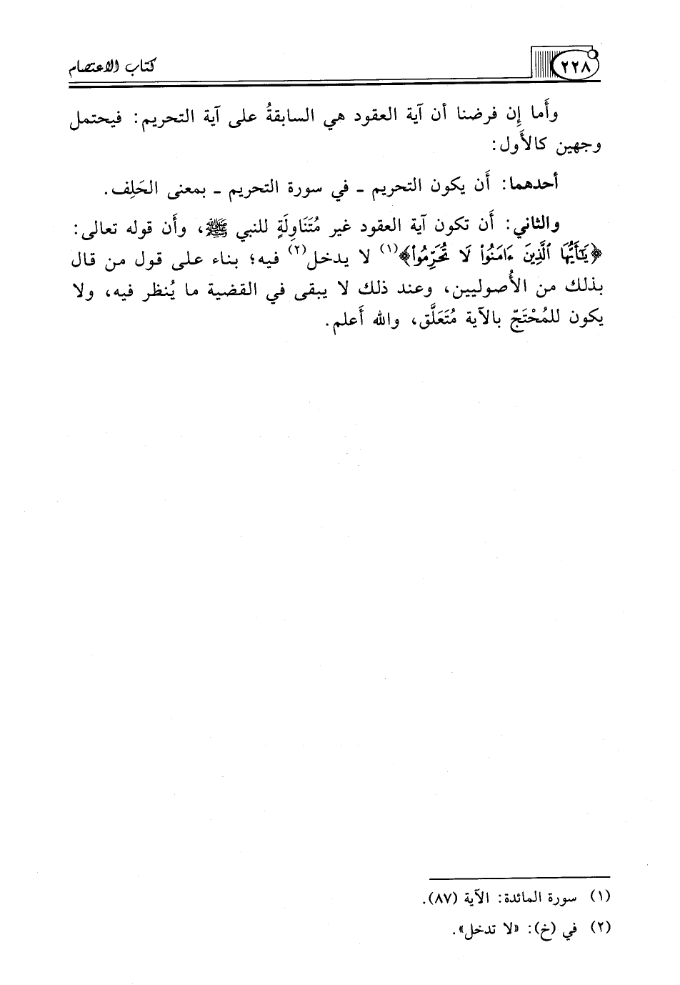 وَالثَّانِي: أَن تَكُونَ آيَةُ الْعُقُودِ غَيْرَ مُتَنَاوِلَةٍ لِلنَّبِيِّ صَلَّى اللَّهُ عَلَيْهِ وَسَلَّمَ، وأَن قوله تعالى: {يَا أَيُّهَا الَّذِينَ آمَنُوا لاَ تُحَرِّمُوا} (¬1) لَا يَدْخُلُ (¬2) فِيهِ؛ بِنَاءً عَلَى قَوْلِ مَنْ قَالَ بِذَلِكَ مِنَ الأُصوليين، وَعِنْدَ ذَلِكَ لَا يَبْقَى فِي الْقَضِيَّةِ مَا يُنظر فِيهِ، وَلَا يكون للمُحْتَجّ بالآية مُتَعَلَّق، والله أَعلم.