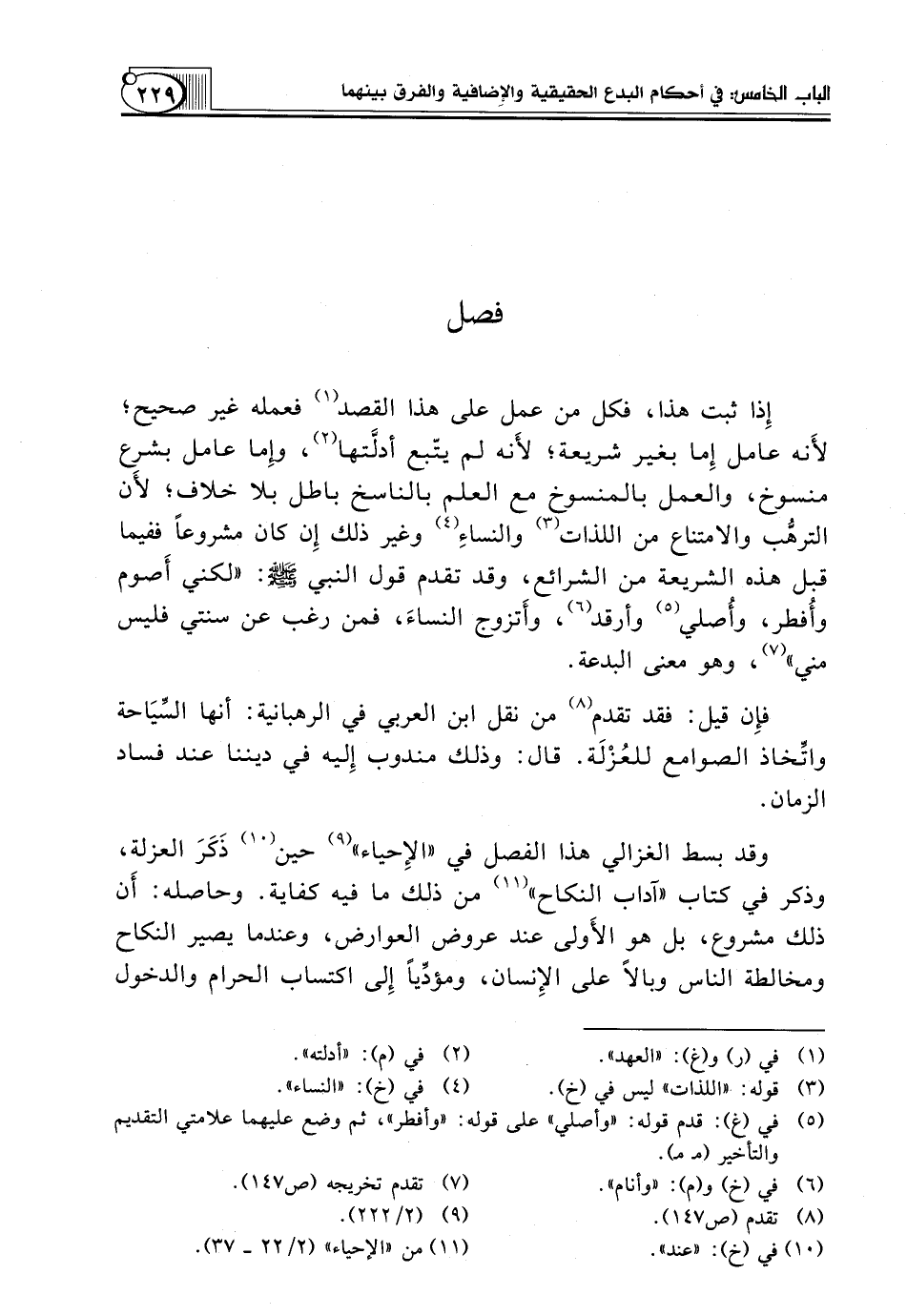 وَقَدْ بَسَطَ الْغَزَالِيُّ هَذَا الْفَصْلَ فِي "الإِحياء" (¬9) حين (¬10) ذَكَرَ الْعُزْلَةِ، وَذَكَرَ فِي كِتَابِ "آدَابِ النِّكَاحِ" (¬11) مِنْ ذَلِكَ مَا فِيهِ كِفَايَةٌ. وَحَاصِلُهُ: أَن ذَلِكَ مَشْرُوعٌ، بَلْ هُوَ الأَولى عِنْدَ عُرُوضِ الْعَوَارِضِ، وَعِنْدَمَا يَصِيرُ النِّكَاحُ وَمُخَالَطَةُ النَّاسِ وَبَالًا عَلَى الإِنسان، ومؤدِّياً إِلى اكْتِسَابِ الْحَرَامِ وَالدُّخُولِ