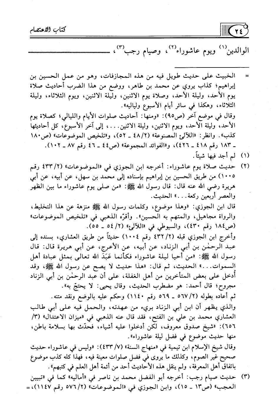 (¬2) حديث صلاة يوم عاشوراء: أخرجه ابن الجوزي في "الموضوعات" (2/ 433 رقم 1005) من طريق الحسين بن إبراهيم بإسناده إلى محمد بن سهل، عن أبيه، عن أبي هريرة رضي الله عنه قال: قال رسول الله صلّى الله عليه وسلّم: "من صلى يوم عاشوراء ما بين الظهر والعصر أربعين ركعة ... " الحديث.