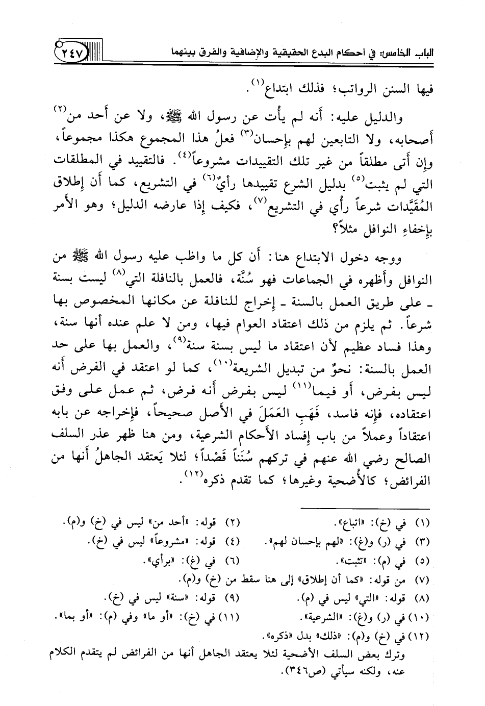 وَالدَّلِيلُ عَلَيْهِ: أَنه لَمْ يأْت عَنْ رَسُولِ اللَّهِ صَلَّى اللَّهُ عَلَيْهِ وَسَلَّمَ، وَلَا عَنْ أَحد مِنَ (¬2) أَصحابه، ولا التَّابِعِينَ لَهُمْ بإِحسان (¬3) فعلُ هَذَا الْمَجْمُوعِ هَكَذَا مَجْمُوعًا، وإِن أَتى مُطْلَقًا مِنْ غَيْرِ تِلْكَ التقييدات مشروعاً (¬4). فالتقييد في المطلقات التي لم يثبت (¬5) بدليل الشرع تقييدها رأيٌ (¬6) في التشريع، كما أَن إِطلاق المُقَيَّدات شرعاً رأْي فِي التَّشْرِيعِ (¬7)، فَكَيْفَ إِذا عَارَضَهُ الدَّلِيلُ؛ وَهُوَ الأَمر بإِخفاءِ النَّوَافِلِ مَثَلًا؟