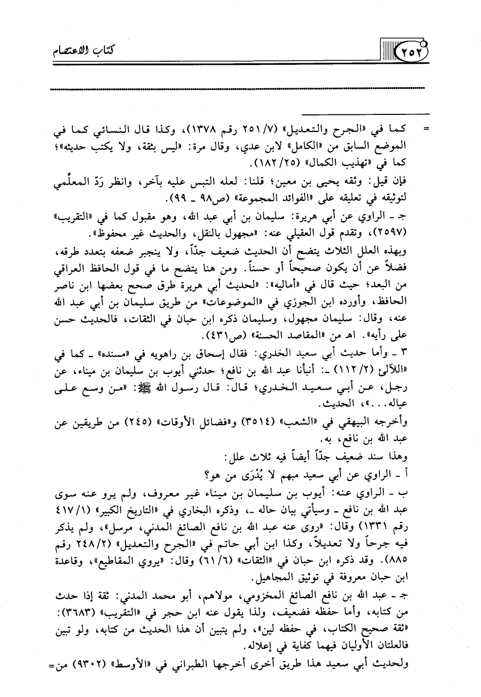 وبهذه العلل الثلاث يتضح أن الحديث ضعيف جداً، ولا ينجبر ضعفه بتعدد طرقه، فضلاً عن أن يكون صحيحاً أو حسناً. ومن هنا يتضح ما في قول الحافظ العراقي من البعد؛ حيث قال في "أماليه": "لحديث أبي هريرة طرق صحح بعضها ابن ناصر الحافظ، وأورده ابن الجوزي في "الموضوعات" من طريق سليمان بن أبي عبد الله عنه، وقال: سليمان مجهول، وسليمان ذكره ابن حبان في الثقات، فالحديث حسن على رأيه" اهـ من "المقاصد الحسنة" (ص431).