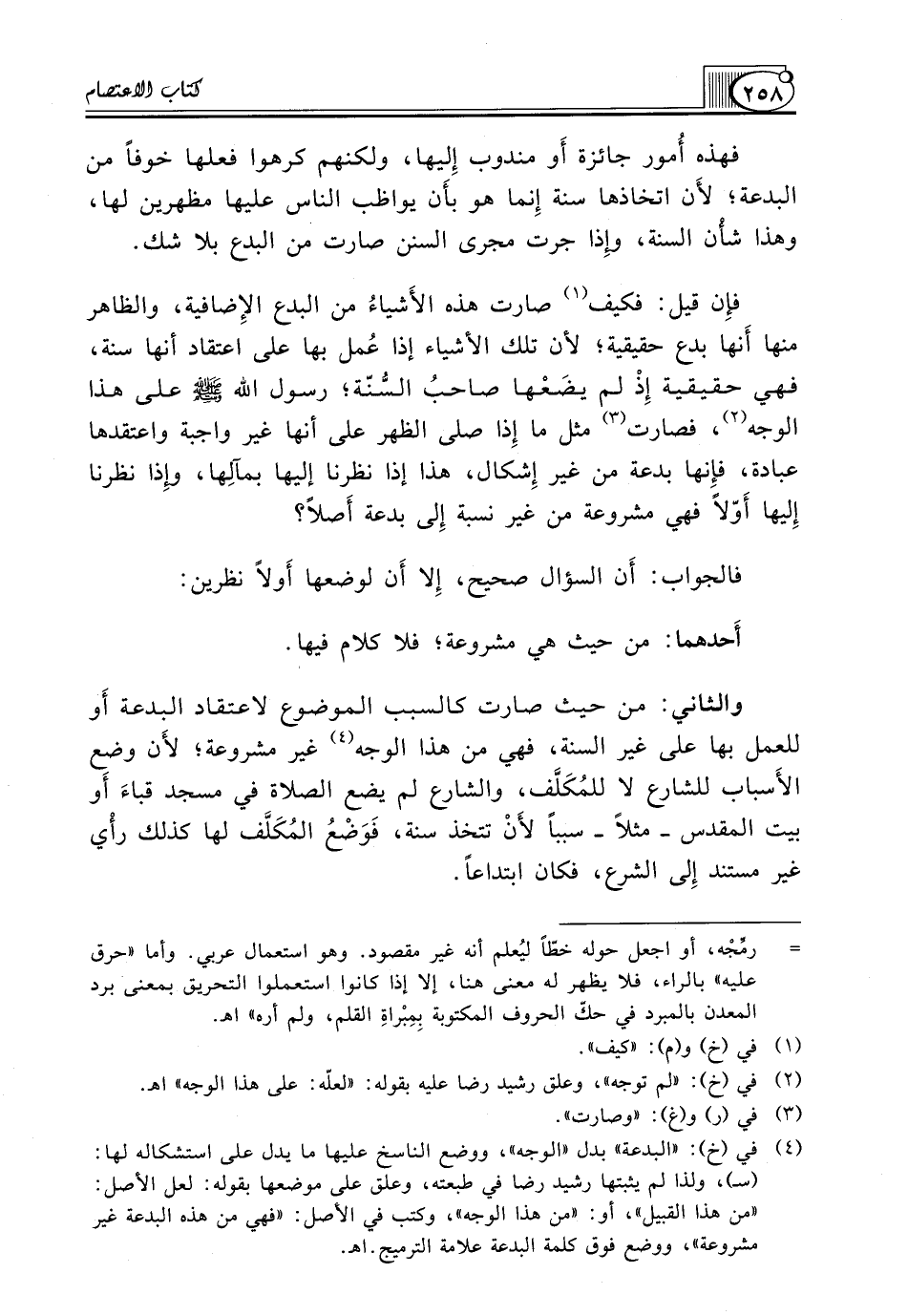 (¬4) في (خ): "البدعة" بدل "الوجه"، ووضع الناسخ عليها ما يدل على استشكاله لها: (سـ)، ولذا لم يثبتها رشيد رضا في طبعته، وعلق على موضعها بقوله: لعل الأصل: "من هذا القبيل"، أو: "من هذا الوجه"، وكتب في الأصل: "فهي من هذه البدعة غير مشروعة"، ووضع فوق كلمة البدعة علامة الترميج. اهـ.