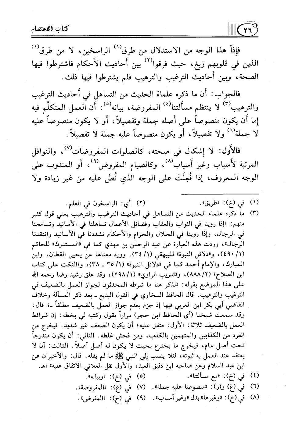 فإِذاً هذا الوجه من الاستدلال من طرق (¬1) الراسخين، لا من طرق (1) الَّذِينَ فِي قُلُوبِهِمْ زَيْغٌ، حَيْثُ فَرَّقُوا (¬2) بَيْنَ أَحاديث الأَحكام فَاشْتَرَطُوا فِيهَا الصِّحَّةَ، وَبَيْنَ أَحاديث التَّرْغِيبِ وَالتَّرْهِيبِ فَلَمْ يَشْتَرِطُوا فِيهَا ذَلِكَ.