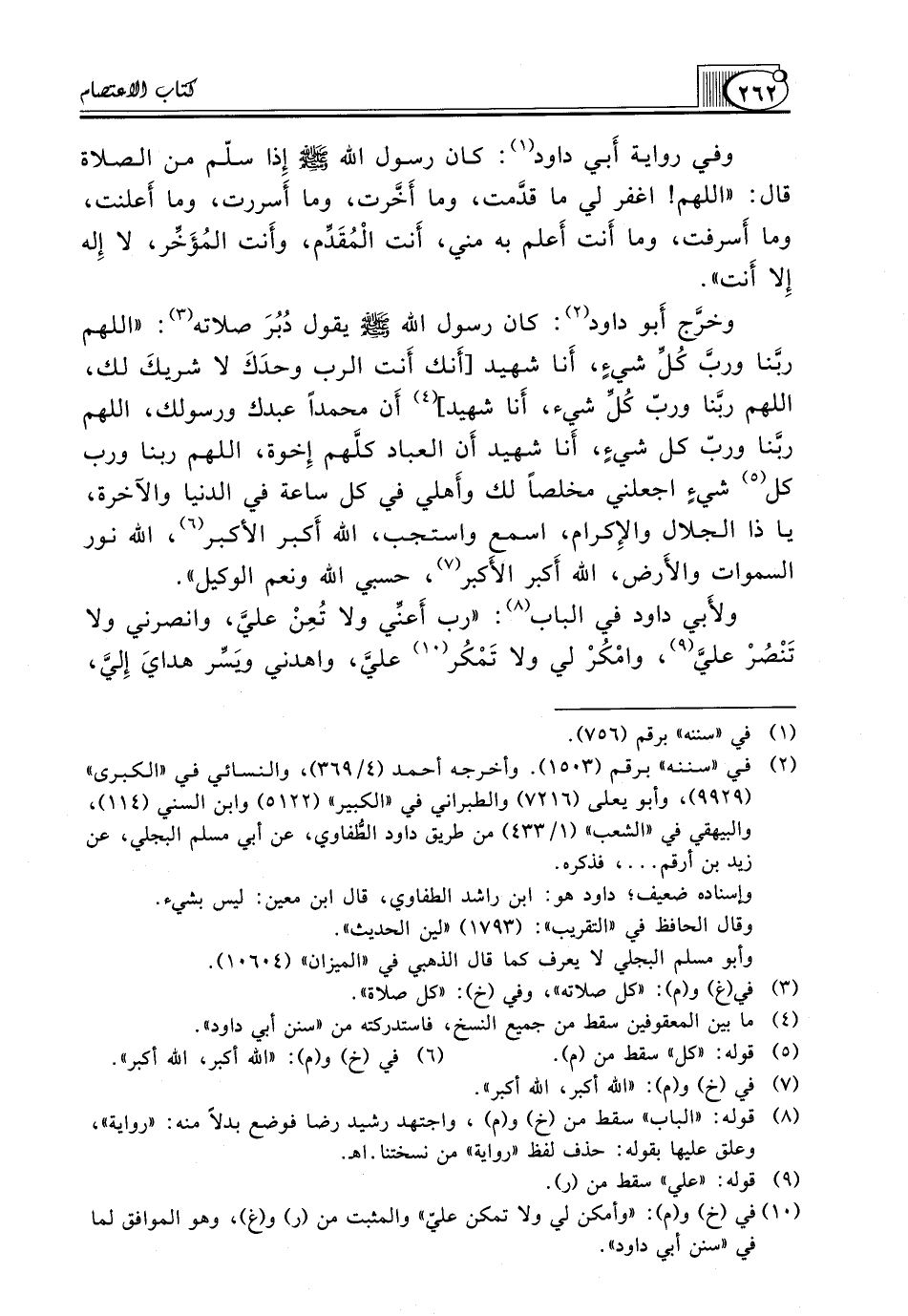 وَفِي رِوَايَةِ أَبي دَاوُدَ (¬1): كَانَ رَسُولُ اللَّهِ صَلَّى اللَّهُ عَلَيْهِ وَسَلَّمَ إِذا سَلَّمَ مِنَ الصَّلَاةِ قَالَ: "اللَّهُمَّ! اغْفِرْ لِي مَا قدَّمت، وَمَا أَخَّرت، وَمَا أَسررت، وَمَا أَعلنت، وَمَا أَسرفت، وَمَا أَنت أَعلم بِهِ مِنِّي، أَنت الْمُقَدِّم، وأَنت المُؤَخِّر، لَا إِله إِلا أَنت".