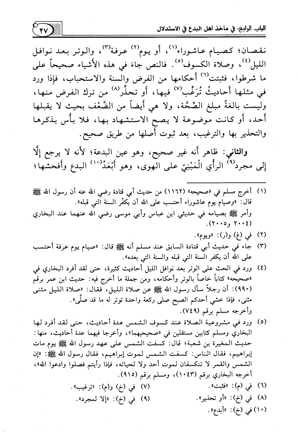 نُقْصَانٍ؛ كَصِيَامِ عَاشُورَاءَ (¬1)، أَو يَوْمَ (¬2) عَرَفَةَ (¬3)، وَالْوَتَرِ بَعْدَ نَوَافِلَ اللَّيْلِ (¬4)، وَصَلَاةِ الْكُسُوفِ (¬5). فَالنَّصُّ جاءَ فِي هَذِهِ الأَشياء صَحِيحًا عَلَى مَا شَرَطُوا، فَثَبَتَتْ (¬6) أَحكامها مِنَ الْفَرْضِ وَالسُّنَّةِ وَالِاسْتِحْبَابِ، فإِذا ورد في مثلها أَحاديثُ تُرَغِّب (¬7) فيها، أَو تحذِّر (¬8) مِنْ تَرْكِ الْفَرْضِ مِنْهَا، وَلَيْسَتْ بَالِغَةً مَبْلَغَ الصِّحَّة، وَلَا هِيَ أَيضاً مِنَ الضَّعْف بِحَيْثُ لَا يَقْبَلُهَا أَحد، أَو كَانَتْ مَوْضُوعَةً لَا يَصِحُّ الِاسْتِشْهَادُ بِهَا، فَلَا بأْس بِذِكْرِهَا وَالتَّحْذِيرِ بِهَا وَالتَّرْغِيبِ، بَعْدَ ثُبُوتِ أَصلها مِنْ طَرِيقٍ صَحِيحٍ.