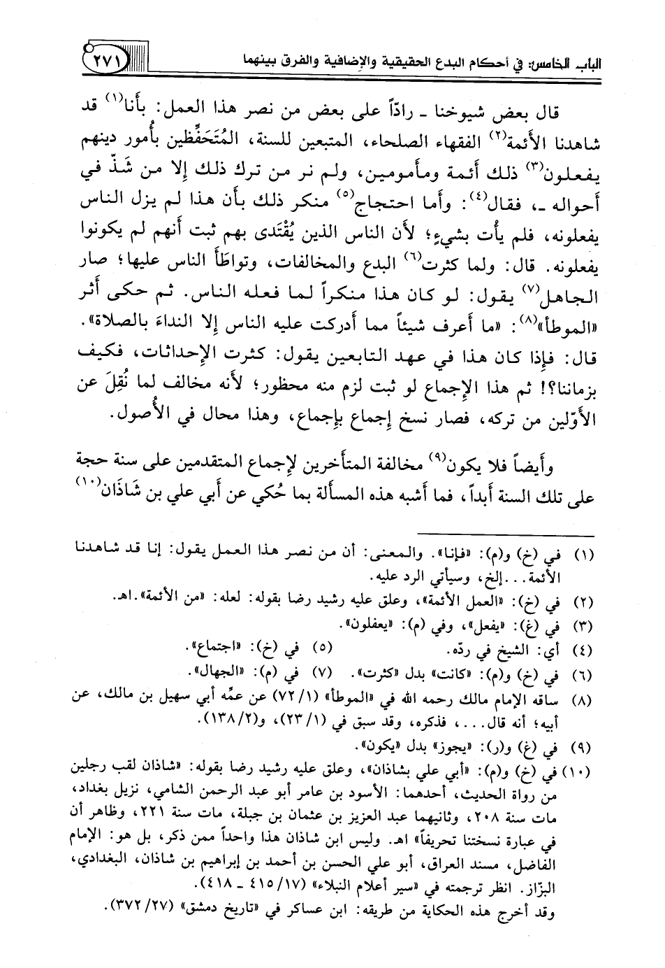 قَالَ بَعْضُ شُيُوخِنَا ـ رَادًّا عَلَى بَعْضِ مَنْ نصر هذا العمل: بأَنا (¬1) قَدْ شَاهَدْنَا الأَئمة (¬2) الْفُقَهَاءَ الصُّلَحَاءَ، الْمُتَّبِعِينَ لِلسُّنَّةِ، المُتَحَفِّظين بأُمور دِينِهِمْ يَفْعَلُونَ (¬3) ذَلِكَ أَئمة ومأَمومين، وَلَمْ نَرَ مَنْ تَرَكَ ذَلِكَ إِلا مَنْ شَذّ فِي أَحواله ـ، فَقَالَ (¬4): وأَما احْتِجَاجُ (¬5) مُنْكِرِ ذَلِكَ بأَن هَذَا لَمْ يَزَلِ النَّاسُ يَفْعَلُونَهُ، فَلَمْ يأْت بشيءٍ؛ لأَن النَّاسَ الَّذِينَ يُقْتَدى بِهِمْ ثَبَتَ أَنهم لَمْ يَكُونُوا يَفْعَلُونَهُ. قَالَ: ولما كثرت (¬6) البدع والمخالفات، وتواطَأَ النَّاسِ عَلَيْهَا؛ صَارَ الْجَاهِلُ (¬7) يَقُولُ: لَوْ كَانَ هَذَا مُنْكَرًا لَمَا فَعَلَهُ النَّاسُ. ثُمَّ حَكَى أَثر "الْمُوَطَّأِ" (¬8): "مَا أَعرف شَيْئًا مِمَّا أَدركت عَلَيْهِ النَّاسَ إِلا النداءَ بِالصَّلَاةِ". قَالَ: فإِذا كَانَ هَذَا فِي عَهْدِ التَّابِعِينَ يَقُولُ: كَثُرَتِ الإِحداثات، فَكَيْفَ بِزَمَانِنَا؟! ثُمَّ هَذَا الإِجماع لَوْ ثَبَتَ لَزِمَ مِنْهُ مَحْظُورٌ؛ لأَنه مُخَالِفٌ لِمَا نُقِلَ عَنِ الأَوّلين مِنْ تَرْكِهِ، فَصَارَ نَسْخُ إِجماع بإِجماع، وَهَذَا مُحَالٌ فِي الأُصول.