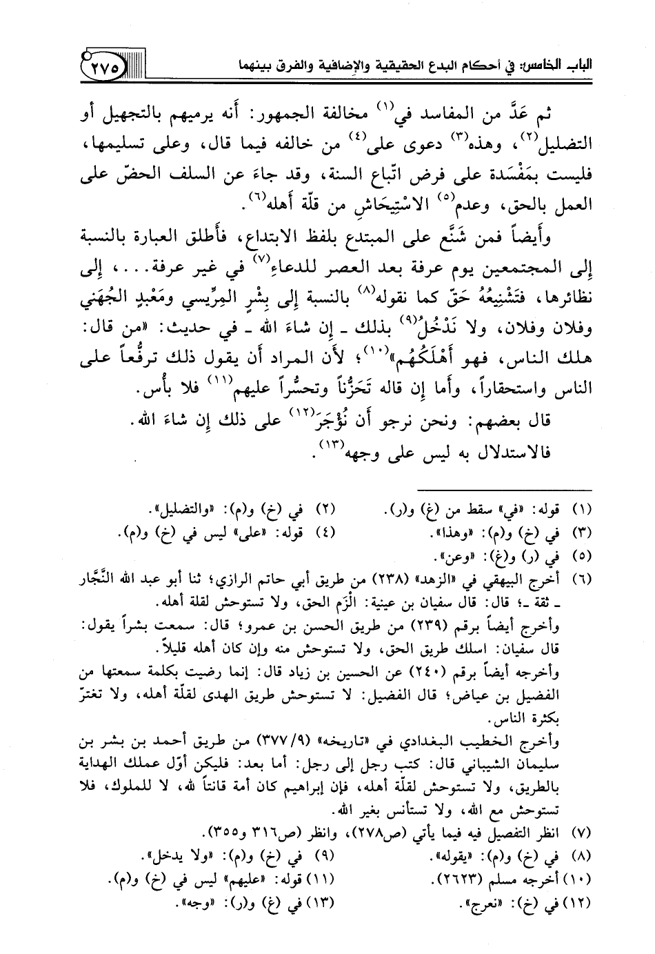 وأَيضاً فَمَنْ شَنَّع عَلَى الْمُبْتَدَعِ بِلَفْظِ الِابْتِدَاعِ، فأَطلق الْعِبَارَةَ بِالنِّسْبَةِ إِلى الْمُجْتَمَعِينَ يَوْمَ عَرَفَةَ بَعْدَ الْعَصْرِ للدعاءِ (¬7) فِي غَيْرِ عَرَفَةَ ... ، إِلى نَظَائِرِهَا، فتَشْنِيعُهُ حَقّ كما نقوله (¬8) بِالنِّسْبَةِ إِلى بِشْرٍ المِرِّيسي ومَعْبدٍ الجُهَني وَفُلَانٍ وفلان، ولا نَدْخُلُ (¬9) بِذَلِكَ ـ إِن شاءَ اللَّهُ ـ فِي حَدِيثِ: "مَنْ قَالَ: هَلَكَ النَّاسُ، فَهُوَ أَهْلَكُهُم" (¬10)؛ لأَن الْمُرَادَ أَن يَقُولَ ذَلِكَ ترفُّعاً عَلَى النَّاسِ وَاسْتِحْقَارًا، وأَما إِن قاله تَحَزُّناً وتحسُّراً عليهم (¬11) فلا بأْس.