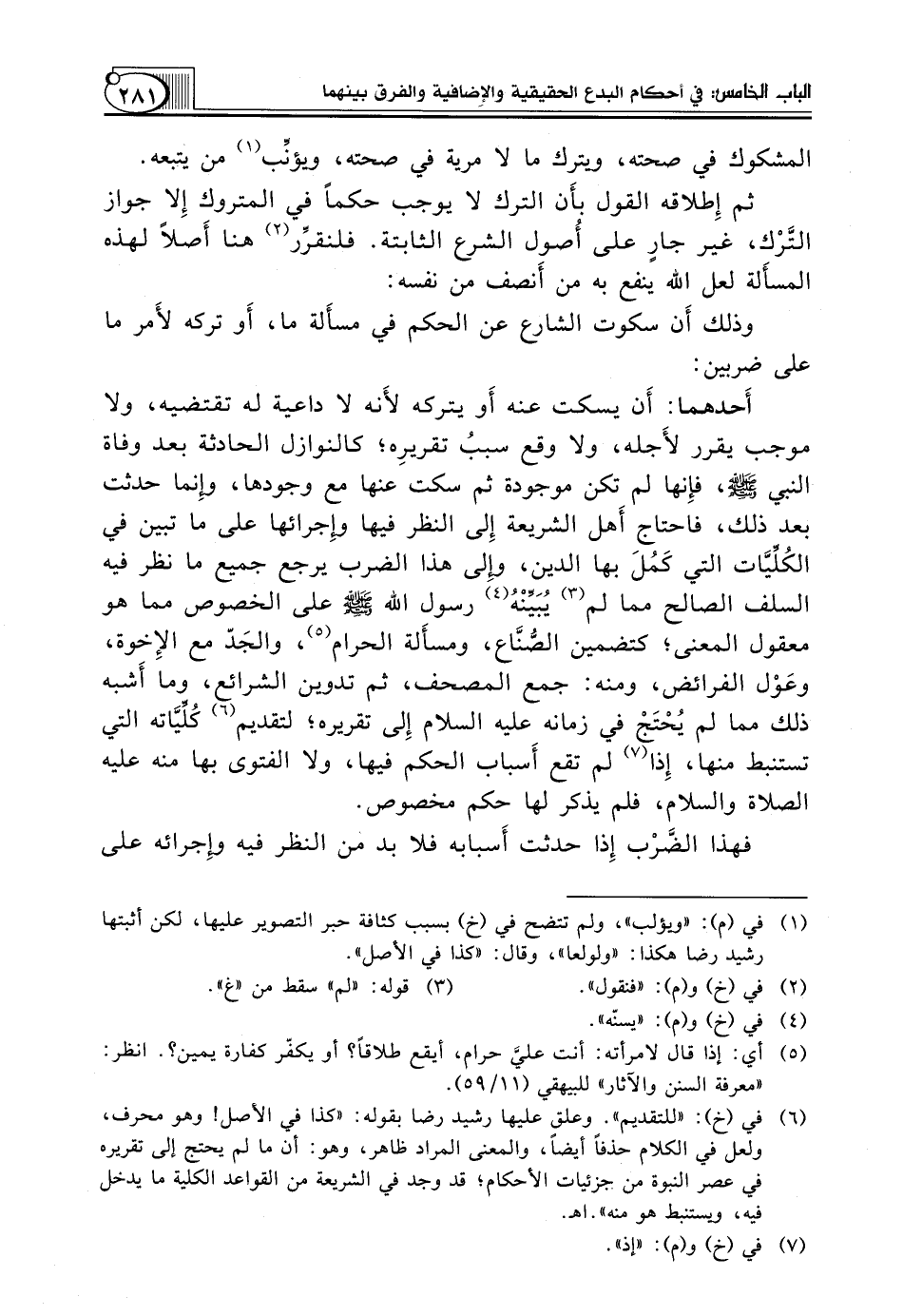 أَحدهما: أَن يَسْكُتَ عَنْهُ أَو يَتْرُكَهُ لأَنه لَا دَاعِيَةَ لَهُ تَقْتَضِيهِ، وَلَا مُوجِبَ يُقَرَّرُ لأَجله، وَلَا وَقَعَ سببُ تقريرِه؛ كَالنَّوَازِلِ الْحَادِثَةِ بَعْدَ وَفَاةِ النَّبِيِّ صَلَّى اللَّهُ عَلَيْهِ وَسَلَّمَ، فإِنها لَمْ تَكُنْ مَوْجُودَةً ثُمَّ سَكَتَ عَنْهَا مَعَ وُجُودِهَا، وإِنما حَدَثَتْ بَعْدَ ذَلِكَ، فَاحْتَاجَ أَهل الشَّرِيعَةِ إِلى النَّظَرِ فِيهَا وإِجرائها عَلَى مَا تَبَيَّنَ فِي الكُلِّيَّات الَّتِي كَمُلَ بِهَا الدِّينُ، وإِلى هَذَا الضَّرْبِ يَرْجِعُ جَمِيعُ مَا نَظَرَ فيه السلف الصالح مما لم (¬3) يُبَيِّنْهُ (¬4) رسول الله صلى الله عليه وسلم على الْخُصُوصِ مِمَّا هُوَ مَعْقُولُ الْمَعْنَى؛ كَتَضْمِينِ الصُّنَّاع، ومسأَلة الْحَرَامِ (¬5)، والجَدّ مَعَ الإِخوة، وعَوْل الْفَرَائِضِ، وَمِنْهُ: جَمْعُ الْمُصْحَفِ، ثُمَّ تَدْوِينُ الشَّرَائِعِ، وَمَا أَشبه ذَلِكَ مِمَّا لَمْ يُحْتَجْ فِي زَمَانِهِ عَلَيْهِ السَّلَامُ إِلى تَقْرِيرِهِ؛ لِتَقْدِيمِ (¬6) كُلِّيَّاته الَّتِي تستنبط مِنْهَا، إِذا (¬7) لَمْ تَقَعْ أَسباب الْحُكْمِ فِيهَا، ولا الفتوى بها منه عليه الصلاة والسلام، فَلَمْ يُذْكَرْ لَهَا حُكْمٌ مَخْصُوصٌ.