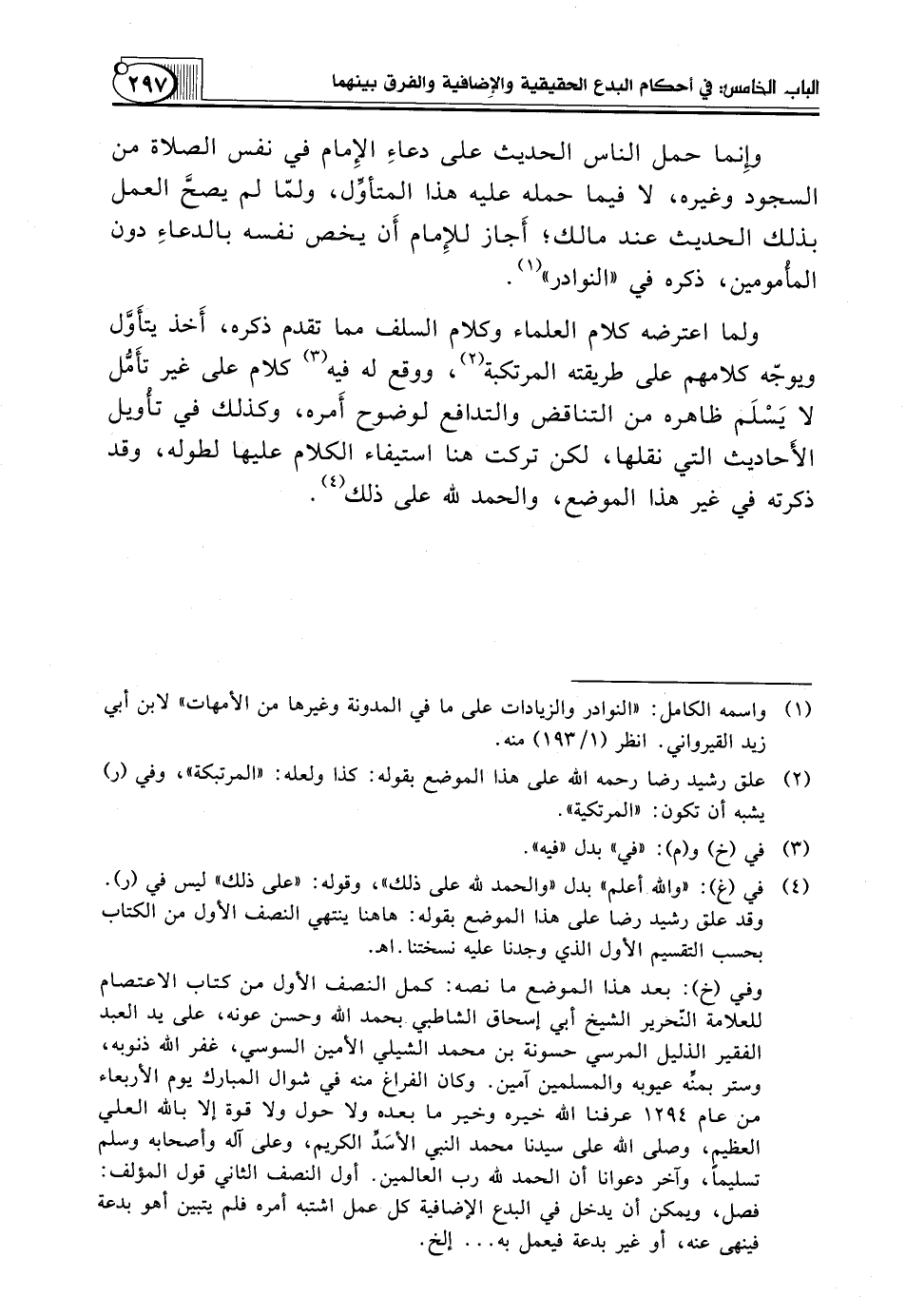 وفي (خ): بعد هذا الموضع ما نصه: كمل النصف الأول من كتاب الاعتصام للعلامة النّحرير الشيخ أبي إسحاق الشاطبي بحمد الله وحسن عونه، على يد العبد الفقير الذليل المرسي حسونة بن محمد الشيلي الأمين السوسي، غفر الله ذنوبه، وستر بمنِّه عيوبه والمسلمين آمين. وكان الفراغ منه في شوال المبارك يوم الأربعاء من عام 1294 عرفنا الله خيره وخير ما بعده ولا حول ولا قوة إلا بالله العلي العظيم، وصلى الله على سيدنا محمد النبي الأسَدِّ الكريم، وعلى آله وأصحابه وسلم تسليماً، وآخر دعوانا أن الحمد لله رب العالمين. أول النصف الثاني قول المؤلف: فصل، ويمكن أن يدخل في البدع الإضافية كل عمل اشتبه أمره فلم يتبين أهو بدعة فينهى عنه، أو غير بدعة فيعمل به ... إلخ.