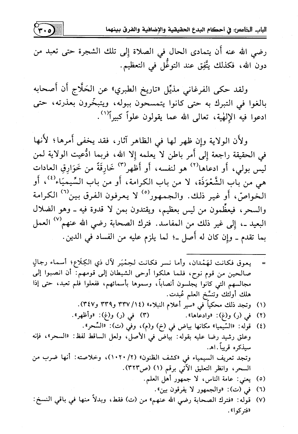 وَلَقَدْ حَكَى الْفَرْغَانِيُّ مذيِّل "تَارِيخِ الطَّبَرِيِّ" عَنِ الحَلاَّج أَن أَصحابه بَالَغُوا فِي التَّبَرُّكِ بِهِ حَتَّى كَانُوا يَتَمَسَّحُونَ بِبَوْلِهِ، وَيَتَبَخَّرُونَ بِعَذْرَتِهِ، حَتَّى ادَّعَوْا فِيهِ الإِلهية، تَعَالَى اللَّهُ عَمَّا يَقُولُونَ عُلُوًّا كَبِيرًا (¬1).