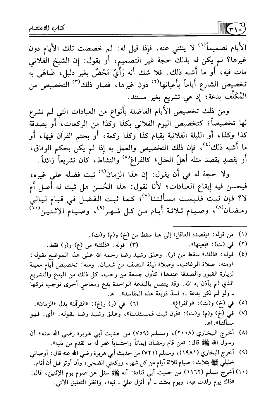 الأَيام تصميماً (¬1) لَا يَنْثَنِي عَنْهُ. فإِذا قِيلَ لَهُ: لِمَ خَصَّصَتْ تِلْكَ الأَيام دُونَ غَيْرِهَا؟ لَمْ يَكُنْ لَهُ بِذَلِكَ حُجَّةٌ غَيْرَ التَّصْمِيمِ، أَو يَقُولُ: إِن الشَّيْخَ الْفُلَانِيَّ مَاتَ فِيهِ، أَو مَا أَشبه ذَلِكَ. فَلَا شَكَّ أَنه رَأْيٌ مَحْضٌ بِغَيْرِ دَلِيلٍ، ضَاهَى بِهِ تَخْصِيصَ الشَّارِعِ أَياماً بأَعيانها (¬2) دون غيرها، فصار ذلك (¬3) التَّخْصِيصُ مِنَ المُكَلَّف بِدْعَةً؛ إِذ هِيَ تَشْرِيعٌ بِغَيْرِ مُسْتَنَدٍ.