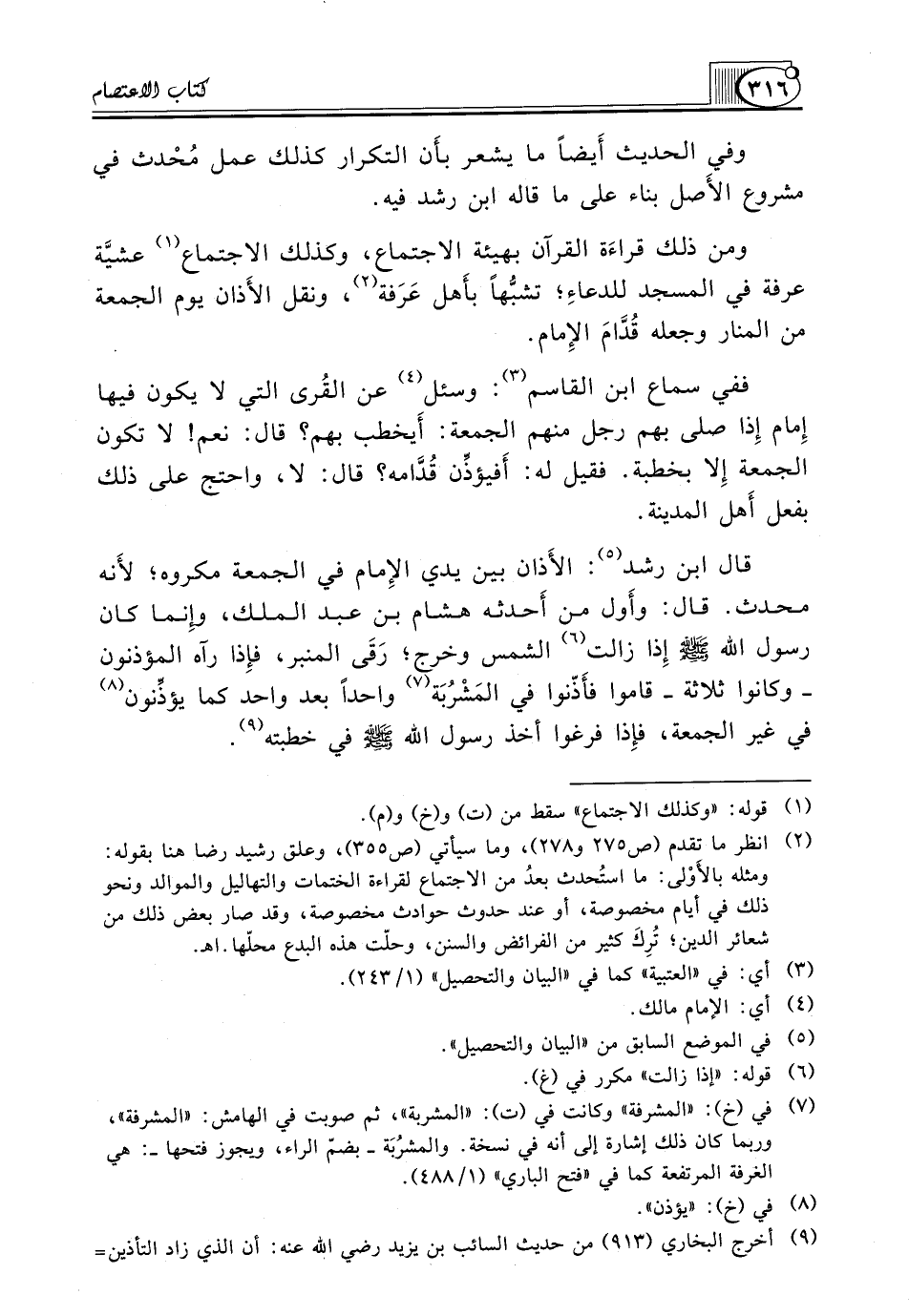 (¬2) انظر ما تقدم (ص275 و278)، وما سيأتي (ص355)، وعلق رشيد رضا هنا بقوله: ومثله بالأَوْلى: ما استُحدث بعدُ من الاجتماع لقراءة الختمات والتهاليل والموالد ونحو ذلك في أيام مخصوصة، أو عند حدوث حوادث مخصوصة، وقد صار بعض ذلك من شعائر الدين؛ تُرِكَ كثير من الفرائض والسنن، وحلّت هذه البدع محلّها. اهـ.