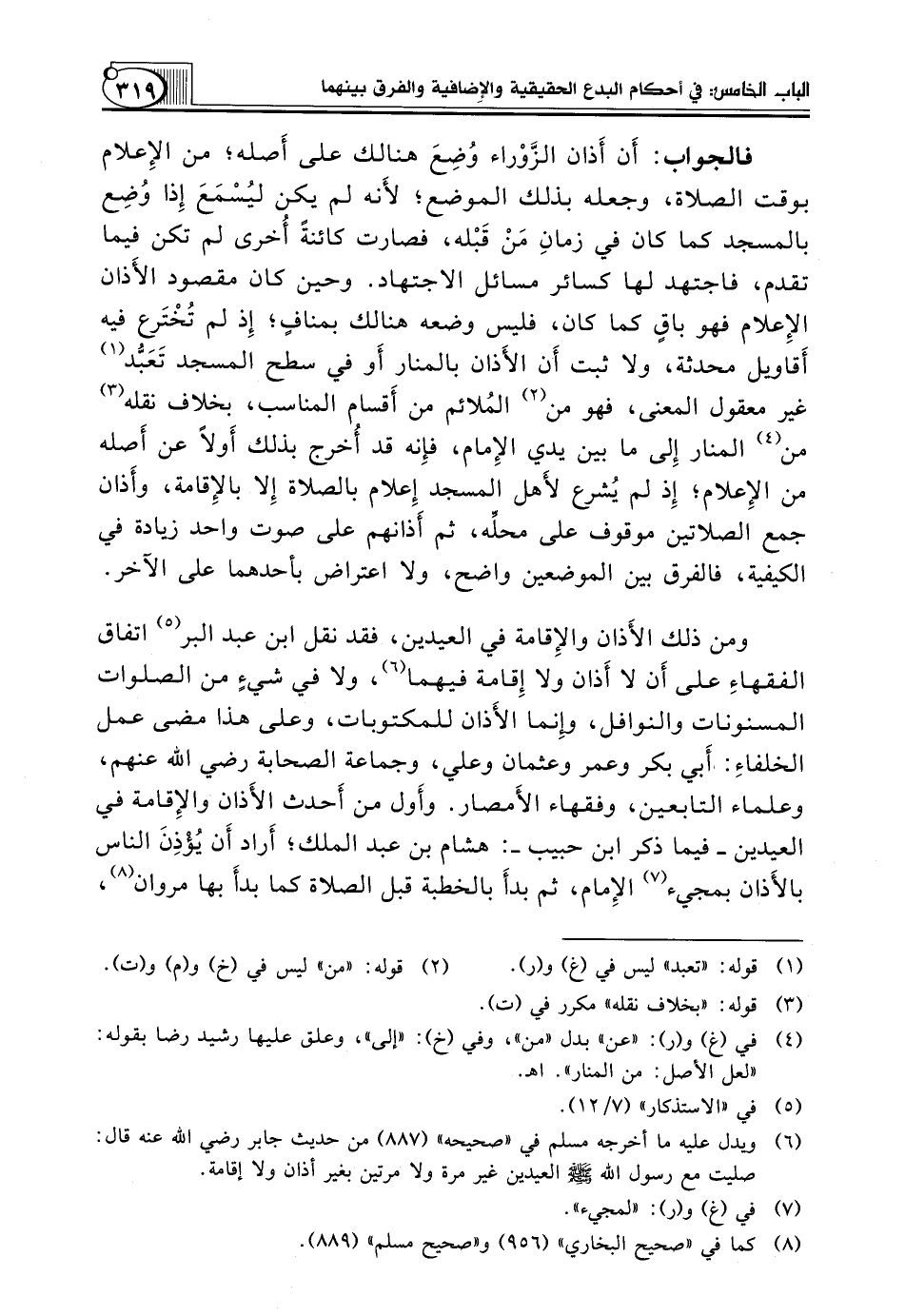 وَمِنْ ذَلِكَ الأَذان والإِقامة فِي الْعِيدَيْنِ، فَقَدْ نَقَلَ ابْنُ عَبْدِ الْبَرِّ (¬5) اتِّفَاقَ الفقهاءِ عَلَى أَن لَا أَذان وَلَا إِقامة فِيهِمَا (¬6)، وَلَا فِي شيءٍ مِنَ الصَّلَوَاتِ الْمَسْنُونَاتِ وَالنَّوَافِلِ، وإِنما الأَذان لِلْمَكْتُوبَاتِ، وَعَلَى هَذَا مَضَى عَمَلُ الخلفاءِ: أَبي بَكْرٍ وَعُمَرَ وَعُثْمَانَ وَعَلِيٍّ، وَجَمَاعَةِ الصَّحَابَةِ رَضِيَ اللَّهُ عَنْهُمْ، وَعُلَمَاءِ التَّابِعِينَ، وَفُقَهَاءِ الأَمصار. وأَول مَنْ أَحدث الأَذان والإِقامة فِي الْعِيدَيْنِ ـ فِيمَا ذَكَرَ ابْنُ حَبِيبٍ ـ: هِشَامُ بْنُ عَبْدِ الْمَلِكِ؛ أَراد أَن يُؤْذِنَ النَّاسَ بالأَذان بِمَجِيءِ (¬7) الإِمام، ثُمَّ بدأَ بِالْخُطْبَةِ قَبْلَ الصَّلَاةِ كَمَا بدأَ بِهَا مروان (¬8)،