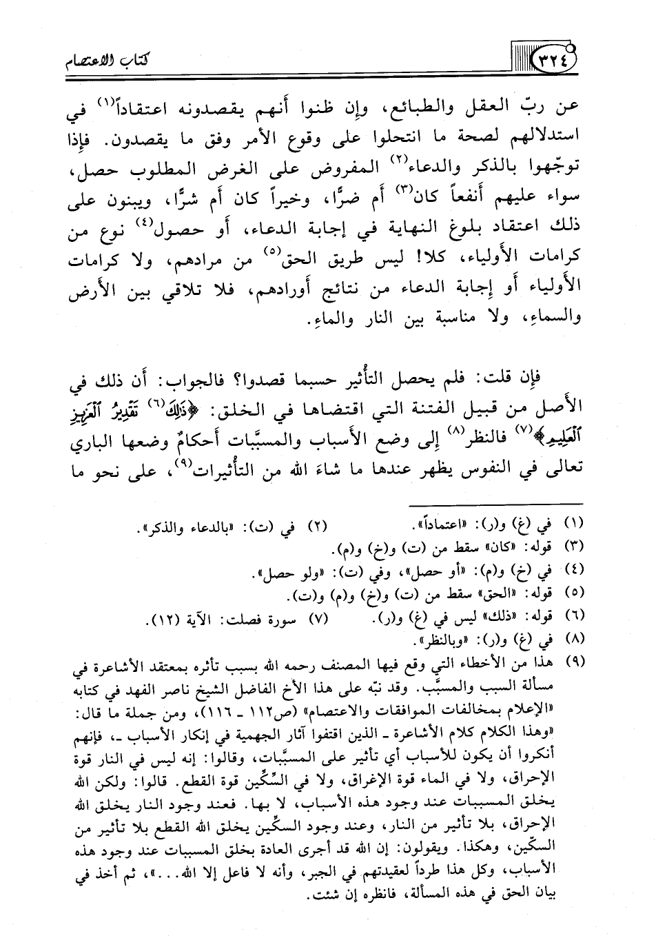 (¬9) هذا من الأخطاء التي وقع فيها المصنف رحمه الله بسبب تأثره بمعتقد الأشاعرة في مسألة السبب والمسبَّب. وقد نبّه على هذا الأخ الفاضل الشيخ ناصر الفهد في كتابه "الإعلام بمخالفات الموافقات والاعتصام" (ص112 ـ 116)، ومن جملة ما قال: "وهذا الكلام كلام الأشاعرة ـ الذين اقتفوا آثار الجهمية في إنكار الأسباب ـ، فإنهم أنكروا أن يكون للأسباب أي تأثير على المسبَّبات، وقالوا: إنه ليس في النار قوة الإحراق، ولا في الماء قوة الإغراق، ولا في السِّكِّين قوة القطع. قالوا: ولكن الله يخلق المسببات عند وجود هذه الأسباب، لا بها. فعند وجود النار يخلق الله الإحراق، بلا تأثير من النار، وعند وجود السكِّين يخلق الله القطع بلا تأثير من السكّين، وهكذا. ويقولون: إن الله قد أجرى العادة بخلق المسببات عند وجود هذه الأسباب، وكل هذا طرداً لعقيدتهم في الجبر، وأنه لا فاعل إلا الله ... "، ثم أخذ في بيان الحق في هذه المسألة، فانظره إن شئت.