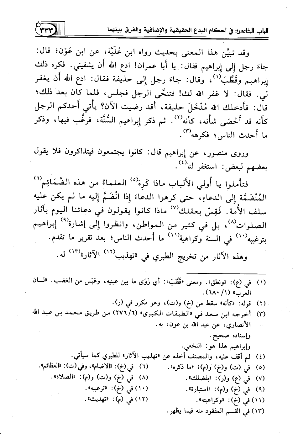 وَقَدْ تبيَّن هَذَا الْمَعْنَى بِحَدِيثٍ رَوَاهُ ابْنُ عُلَيَّة، عَنِ ابْنِ عَوْن؛ قَالَ: جاءَ رَجُلٌ إِلى إِبراهيم فَقَالَ: يَا أَبا عِمْرَانَ! ادْعُ اللَّهَ أَن يَشْفِيَنِي. فِكْرَهَ ذَلِكَ إِبراهيم وقَطَّبَ (¬1)، وَقَالَ: جاءَ رَجُلٌ إِلى حُذَيْفَةَ فَقَالَ: ادْعُ اللَّهَ أَن يَغْفِرَ لِي. فَقَالَ: لَا غَفَرَ اللَّهُ لَكَ! فتنحَّى الرَّجُلُ فَجَلَسَ، فَلَمَّا كَانَ بَعْدَ ذَلِكَ؛ قَالَ: فأَدخلك اللَّهُ مُدْخَلَ حُذَيْفَةَ، أَقد رَضِيتَ الْآنَ؟ يأْتي أَحدكم الرَّجُلَ كأَنه قد أَحْصَى شأْنه، كأنه (¬2). ثُمَّ ذَكَرَ إِبراهيم السُّنَّة، فرغَّب فِيهَا، وَذَكَرَ مَا أَحدث النَّاسُ؛ فَكَرِهَهُ (¬3).
