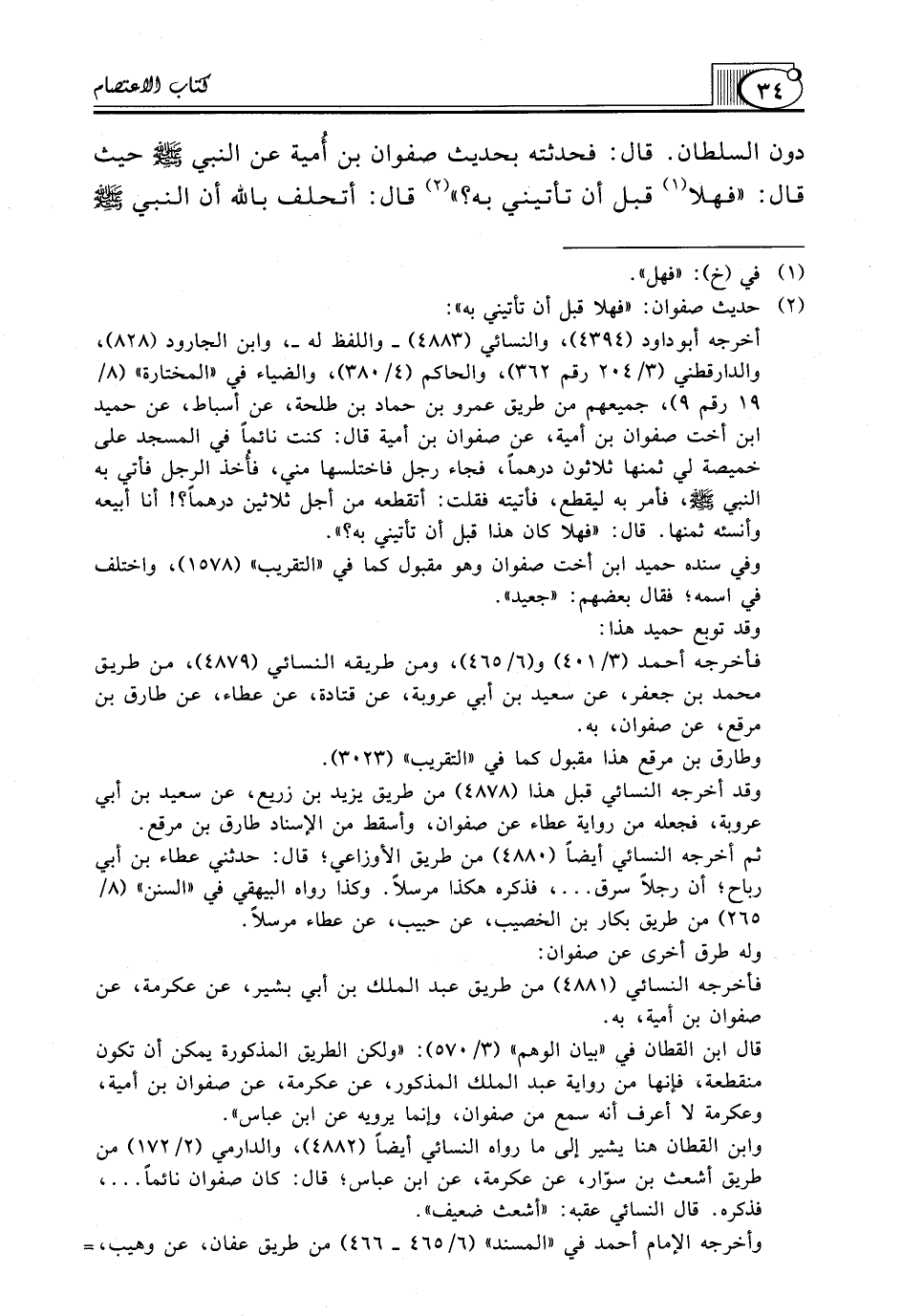 دُونَ السُّلْطَانِ. قَالَ: فَحَدَّثْتُهُ بِحَدِيثِ صَفْوَانَ بْنِ أُمية عَنِ النَّبِيِّ صَلَّى اللَّهُ عَلَيْهِ وَسَلَّمَ حَيْثُ قَالَ: "فَهَلَّا (¬1) قَبْلَ أَنْ تَأْتِيَنِي بِهِ؟ " (¬2) قَالَ: أَتَحْلِفُ بِاللَّهِ أَنَّ النَّبِيَّ صَلَّى اللَّهُ عليه وسلّم