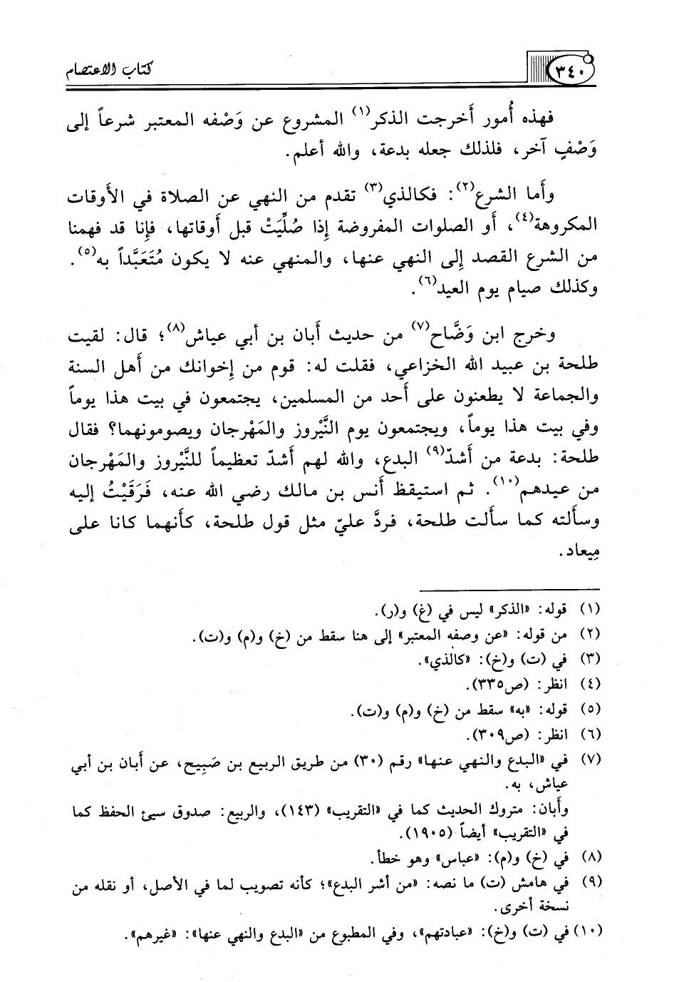 وَخَرَّجَ ابْنُ وَضَّاح (¬7) مِنْ حَدِيثِ أَبان بْنِ أَبِي عياش (¬8)؛ قَالَ: لَقِيتُ طَلْحَةَ بْنَ عُبَيْدِ اللَّهِ الْخُزَاعِيَّ، فَقُلْتُ لَهُ: قَوْمٌ مِنْ إِخوانك مِنَ أَهل السُّنَّةِ وَالْجَمَاعَةِ لَا يَطْعَنُونَ عَلَى أَحد مِنَ الْمُسْلِمِينَ، يَجْتَمِعُونَ فِي بَيْتِ هَذَا يَوْمًا وَفِي بَيْتِ هَذَا يَوْمًا، وَيَجْتَمِعُونَ يَوْمَ النَّيْروز والمَهْرجان ويصومونهما؟ فَقَالَ طَلْحَةُ: بِدْعَةٌ مِنْ أَشدّ (¬9) الْبِدَعِ، وَاللَّهِ لَهُمْ أَشدّ تَعْظِيمًا للنَّيْروز والمَهْرجان مِنْ عِيدِهِمْ (¬10). ثُمَّ اسْتَيْقَظَ أَنس بْنُ مَالِكٍ رَضِيَ اللَّهُ عَنْهُ، فَرَقَيْتُ إِلَيْهِ وسأَلته كَمَا سأَلت طَلْحَةَ، فردَّ عليّ مثل قول طلحة، كأَنهما كانا على مِيعاد.