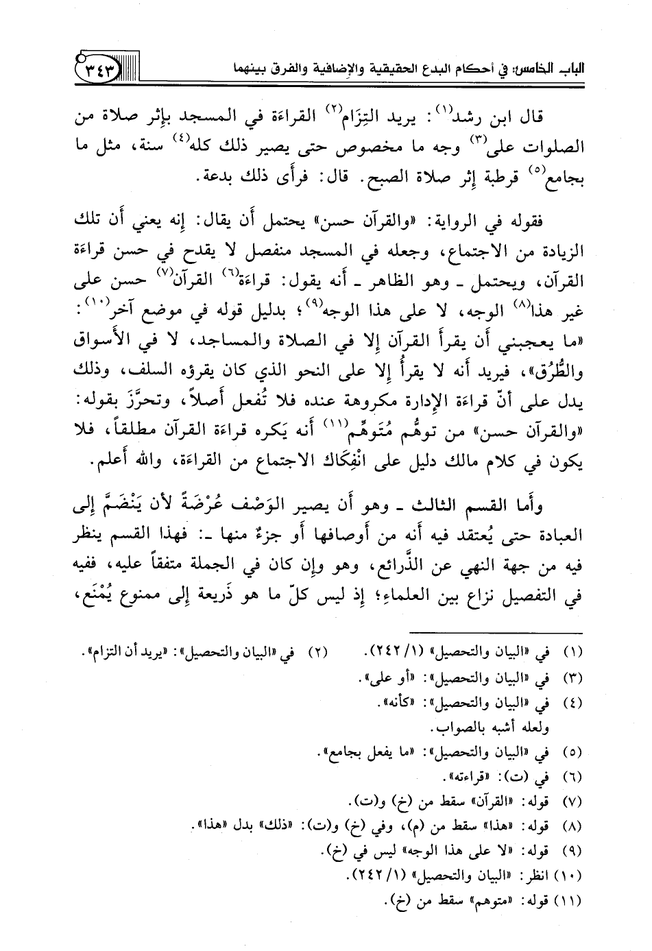 قَالَ ابْنُ رُشْدٍ (¬1): يُرِيدُ التِزَام (¬2) القراءَة فِي الْمَسْجِدِ بإِثر صَلَاةٍ مِنَ الصَّلَوَاتِ عَلَى (¬3) وَجْهٍ مَّا مَخْصُوصٌ حَتَّى يَصِيرَ ذَلِكَ كُلُّهُ (¬4) سُنَّةً، مِثْلَ مَا بِجَامِعِ (¬5) قُرْطُبَةَ إِثر صَلَاةِ الصُّبْحِ. قَالَ: فرأَى ذَلِكَ بِدْعَةً.