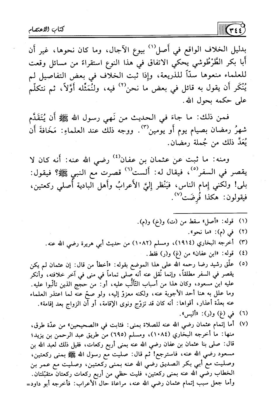 (¬5) علّق رشيد رضا رحمه الله على هذا الموضع بقوله: "أخطأ من قال: إن عثمان لم يكن يقصر في السفر مطلقاً، وإنما نُقل عنه أنه صلى تماماً في منى في آخر خلافته، وأنكر عليه ابن مسعود، وكان هذا من أسباب التّأَلُّب عليه، أو: من حجج الذين تألّبوا عليه. وما علل به هنا أحد الأجوبة عنه، ولكنه معزوّ إليه، ولو صحّ عنه لما اعتذر العلماء عنه بعدّة أعذار، أقواها: أنه كان قد تزوّج ونوى الإقامة، أو أن الزواج بعد إقامة".