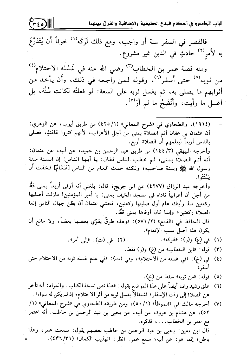 فَالْقَصْرُ فِي السَّفَرِ سُنَّةٌ أَو وَاجِبٌ، وَمَعَ ذلك تَرَكَه (¬1) خوفاً أَن يُتَذرَّعَ بِهِ لأَمرٍ (¬2) حادثٍ فِي الدِّينِ غير مشروع.