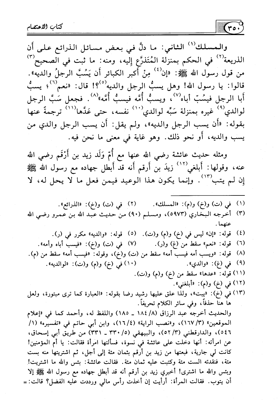 والمسلك (¬1) الثَّانِي: مَا دلَّ فِي بَعْضِ مَسَائِلِ الذَّرَائِعِ على أَن الذريعة (¬2) فِي الْحُكْمِ بِمَنْزِلَةِ المُتَذرَّع إِليه، وَمِنْهُ: مَا ثَبَتَ فِي الصَّحِيحِ (¬3) مِنْ قَوْلِ رَسُولِ اللَّهِ صلّى الله عليه وسلّم: "إن (¬4) مِنْ أَكبر الْكَبَائِرِ أَن يَسُبَّ الرجلُ وَالِدَيْهِ". قَالُوا: يَا رَسُولَ اللَّهِ! وَهَلْ يسبُّ الرَّجُلُ وَالِدَيْهِ (¬5)؟! قَالَ: "نَعَمْ (¬6)؛ يسبُّ أَبا الرَّجُلِ فيسُبّ أباه (¬7)، ويسبُّ أُمَّه فيسبُّ أُمَّه" (¬8). فَجَعَلَ سَبَّ الرَّجُلِ لِوَالِدَيْ (¬9) غَيْرِهِ بِمَنْزِلَةِ سَبِّه لوالدي (¬10) نفسه، حتى عَدَّها (¬11) تَرْجَمَهُ عَنْهَا بِقَوْلِهِ: "أَن يَسُبَّ الرَّجُلُ وَالِدَيْهِ"، وَلَمْ يَقُلْ: أَن يَسُبَّ الرَّجُلُ وَالِدَيْ مَنْ يَسُبُّ وَالِدَيْهِ، أَو نَحْوَ ذَلِكَ. وَهُوَ غَايَةُ في مَعْنَى مَا نَحْنُ فِيهِ.
