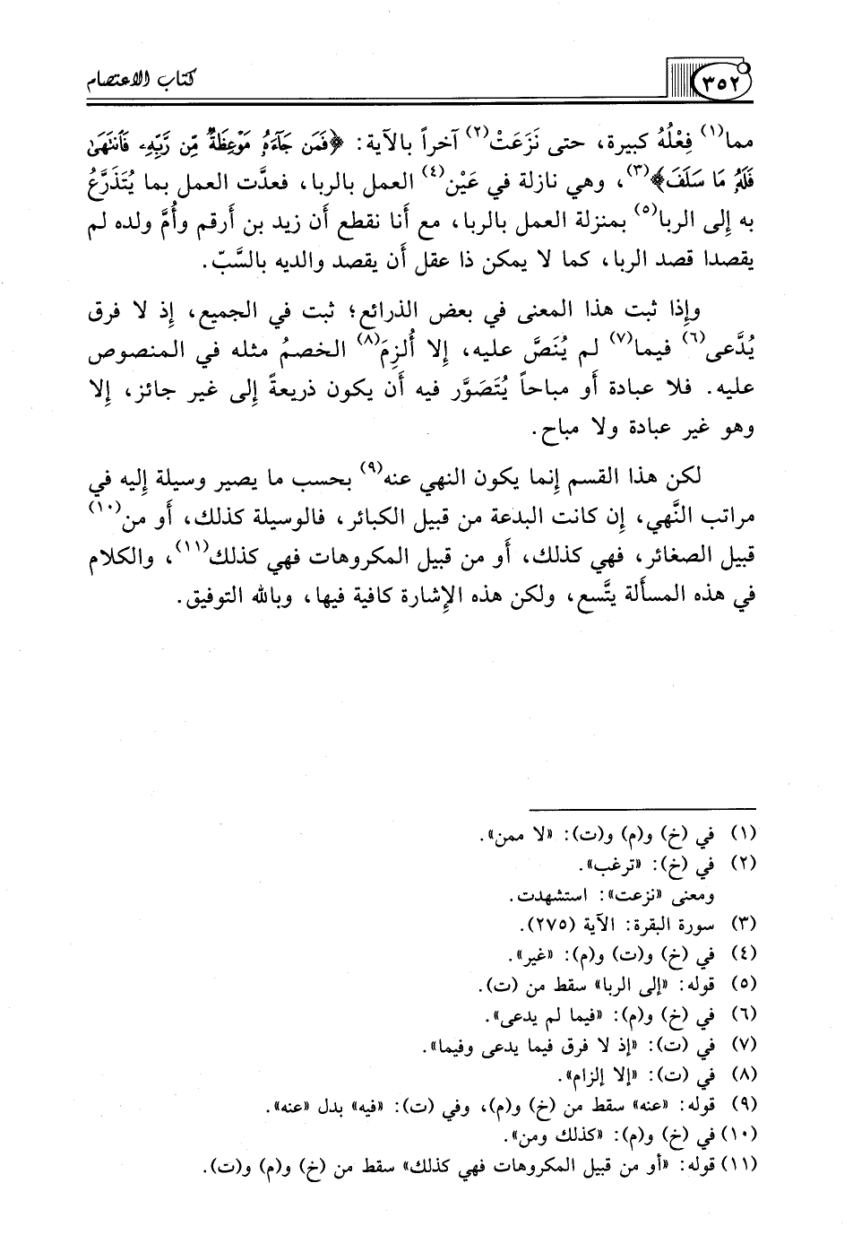 مِمَّا (¬1) فِعْلُهُ كَبِيرَةٌ، حَتَّى نَزَعَتْ (¬2) آخِرًا بِالْآيَةِ: {فَمَنْ جَاءَهُ مَوْعِظَةٌ مِنْ رَبِّهِ فَانْتَهَى فَلَهُ مَا سَلَفَ} (¬3)، وهي نازلة في عَيْن (¬4) الْعَمَلِ بِالرِّبَا، فعدَّت الْعَمَلَ بِمَا يُتَذَرَّعُ بِهِ إِلى الرِّبَا (¬5) بِمَنْزِلَةِ الْعَمَلِ بِالرِّبَا، مَعَ أَنا نَقْطَعُ أَن زَيْدَ بْنَ أَرقم وأُمَّ وَلَدِهِ لم يقصدا قَصْدَ الرِّبَا، كَمَا لَا يُمْكِنُ ذَا عَقْلٍ أَن يَقْصِدَ وَالِدَيْهِ بالسَّبّ.