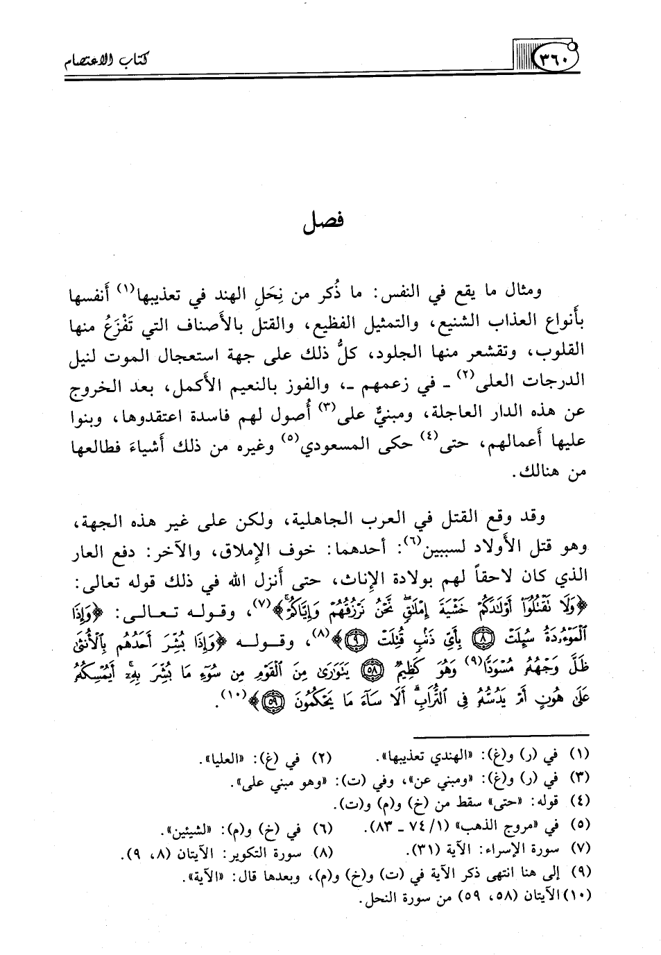 وَمِثَالُ مَا يَقَعُ فِي النَّفْسِ: مَا ذُكر مِنْ نِحَلِ الْهِنْدِ فِي تَعْذِيبِهَا (¬1) أَنفسها بأَنواع العذاب الشنيع، والتمثيل الفظيع، وَالْقَتْلِ بالأَصناف الَّتِي تَفْزَعُ مِنْهَا الْقُلُوبُ، وَتَقْشَعِرُّ مِنْهَا الْجُلُودُ، كلُّ ذَلِكَ عَلَى جِهَةِ اسْتِعْجَالِ الْمَوْتِ لِنَيْلِ الدَّرَجَاتِ الْعُلَى (¬2) ـ فِي زَعْمِهِمْ ـ، وَالْفَوْزِ بِالنَّعِيمِ الأَكمل، بَعْدَ الْخُرُوجِ عَنْ هَذِهِ الدَّارِ الْعَاجِلَةِ، ومبنيٌّ عَلَى (¬3) أُصول لَهُمْ فَاسِدَةٍ اعْتَقَدُوهَا، وبنوا عليها أَعمالهم، حتى (¬4) حَكَى الْمَسْعُودِيُّ (¬5) وَغَيْرُهُ مِنْ ذَلِكَ أَشياءَ فَطَالَعَهَا مِنْ هُنَالِكَ.