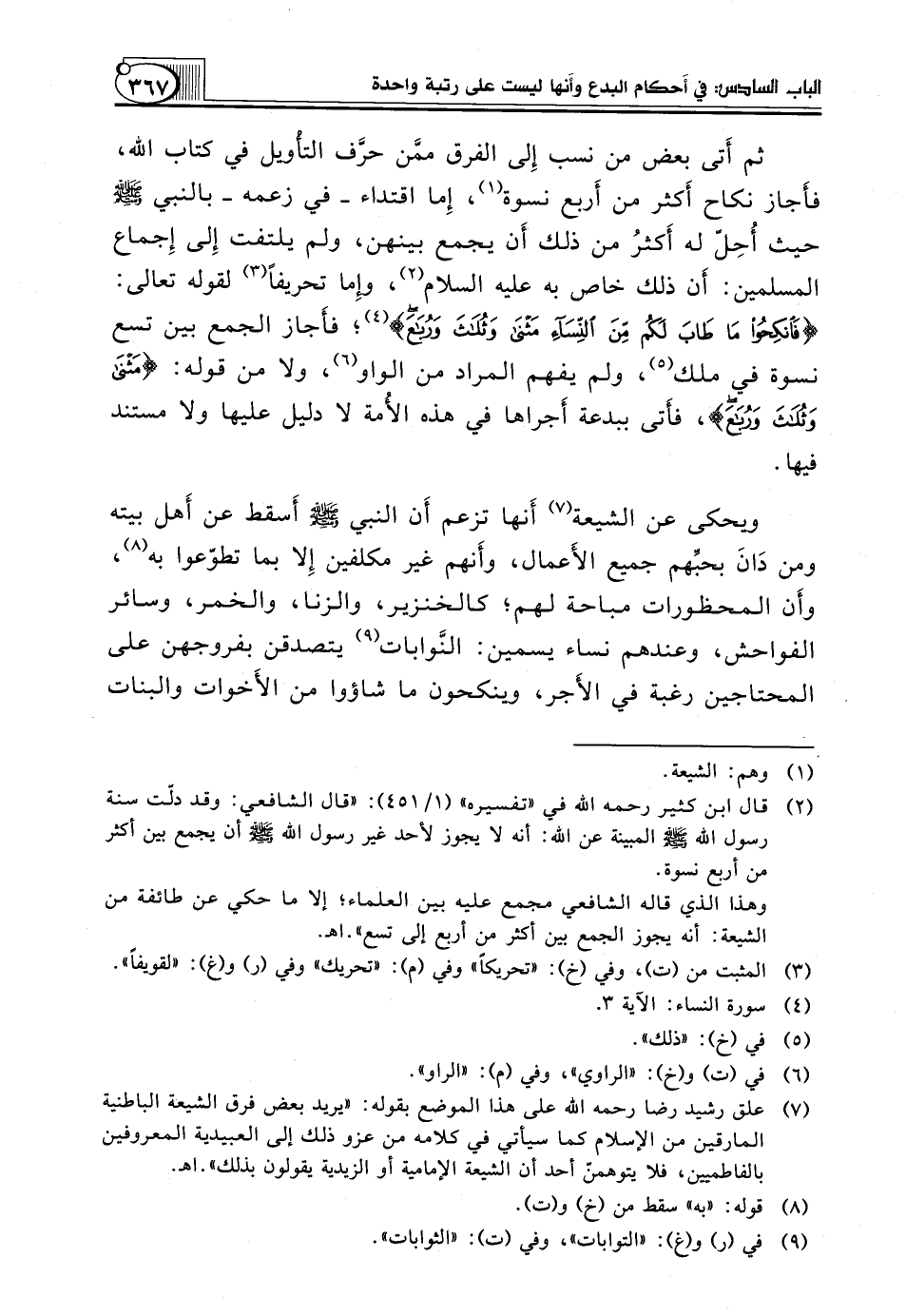 ثُمَّ أَتى بَعْضُ مَنْ نُسِبَ إِلى الْفِرَقِ ممَّن حرَّف التأْويل فِي كِتَابِ اللَّهِ، فأَجاز نِكَاحَ أَكثر مِنْ أَربع نِسْوَةٍ (¬1)، إِما اقْتِدَاءً ـ فِي زَعْمِهِ ـ بِالنَّبِيِّ صَلَّى اللَّهُ عَلَيْهِ وَسَلَّمَ حَيْثُ أُحِلّ لَهُ أَكثرُ مِنْ ذَلِكَ أَن يَجْمَعَ بَيْنَهُنَّ، وَلَمْ يَلْتَفِتْ إِلى إِجماع الْمُسْلِمِينَ: أَن ذَلِكَ خَاصٌّ بِهِ عَلَيْهِ السَّلَامُ (¬2)، وإِما تَحْرِيفًا (¬3) لِقَوْلِهِ تَعَالَى: {فَانْكِحُوا مَا طَابَ لَكُمْ مِنَ النِّسَاءِ مَثْنَى وَثُلاَثَ وَرُبَاعَ} (¬4)؛ فأَجاز الجمع بين تسع نسوة في ملك (¬5)، ولم يفهم المراد من الواو (¬6)، ولا من قوله: {مَثْنَى وَثُلاَثَ وَرُبَاعَ}، فأَتى بِبِدْعَةٍ أَجراها فِي هَذِهِ الأُمة لَا دَلِيلَ عَلَيْهَا وَلَا مُسْتَنَدَ فِيهَا.