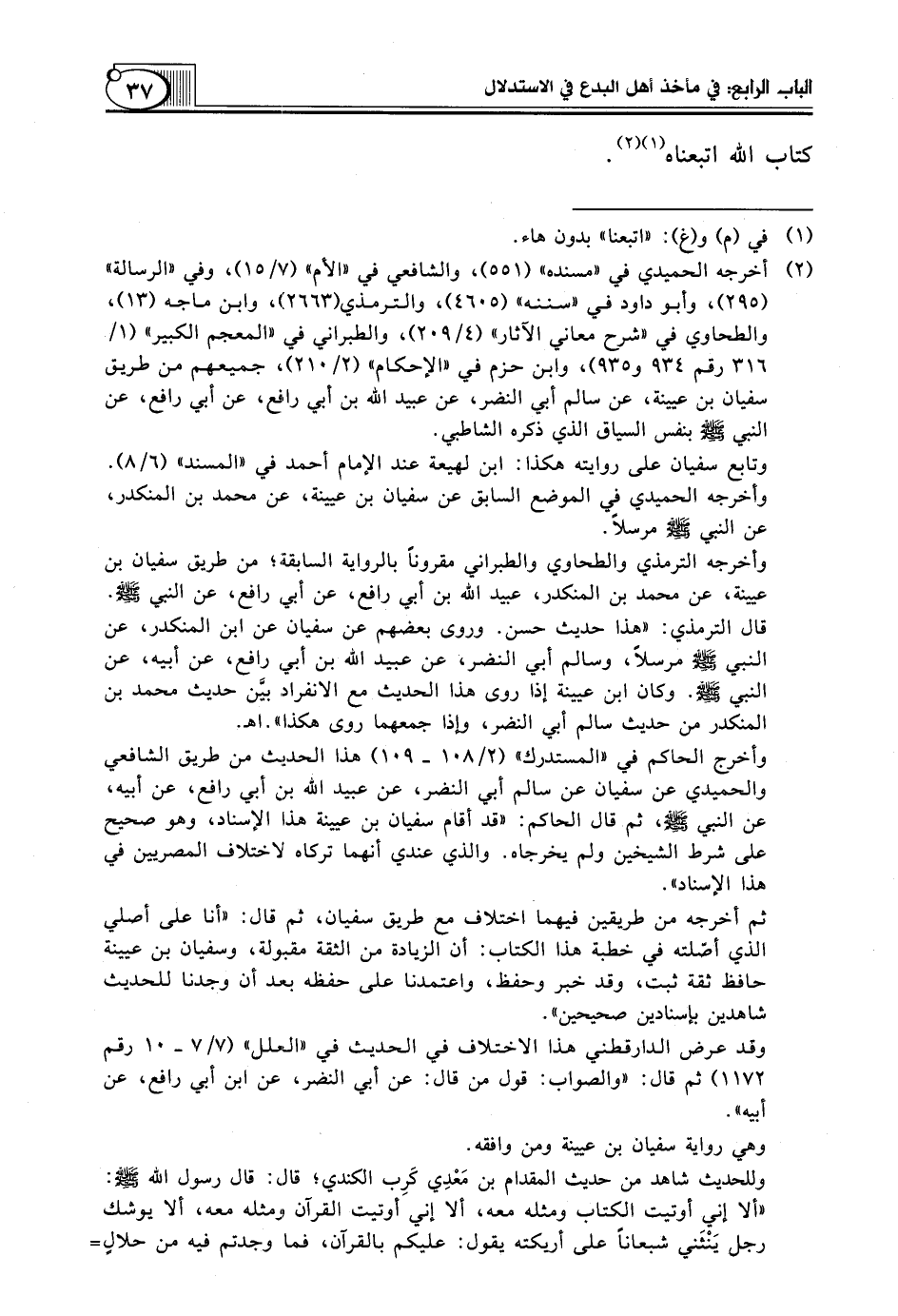 (¬2) أخرجه الحميدي في "مسنده" (551)، والشافعي في "الأم" (7/ 15)، وفي "الرسالة" (295)، وأبو داود في "سننه" (4605)، والترمذي (2663)، وابن ماجه (13)، والطحاوي في "شرح معاني الآثار" (4/ 209)، والطبراني في "المعجم الكبير" (1/ 316 رقم 934 و935)، وابن حزم في "الإحكام" (2/ 210)، جميعهم من طريق سفيان بن عيينة، عن سالم أبي النضر، عن عبيد الله بن أبي رافع، عن أبي رافع، عن النبي صلّى الله عليه وسلّم بنفس السياق الذي ذكره الشاطبي.