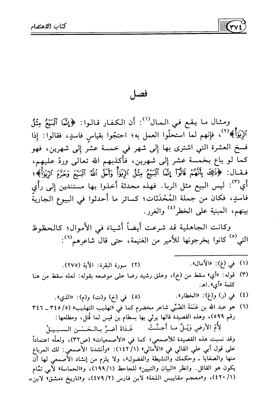 وَمِثَالُ مَا يَقَعُ فِي الْمَالِ (¬1): أَن الْكُفَّارَ قالوا: {إِنَّمَا الْبَيْعُ مِثْلُ الرِّبَا} (¬2)، فإِنهم لما استحلّوا العمل به؛ احتجّوا بقياسٍ فاسدٍ، فَقَالُوا: إِذا فَسَخَ الْعَشَرَةَ الَّتِي اشْتَرَى بِهَا إِلى شَهْرٍ فِي خَمْسَةَ عَشَرَ إِلى شَهْرَيْنِ، فَهُوَ كَمَا لَوْ بَاعَ بِخَمْسَةَ عَشَرَ إِلى شَهْرَيْنِ، فأَكذبهم اللَّهُ تَعَالَى وَرَدَّ عَلَيْهِمْ، فَقَالَ: {ذَلِكَ بِأَنَّهُمْ قَالُوا إِنَّمَا الْبَيْعُ مِثْلُ الرِّبَا وَأَحَلَّ اللَّهُ الْبَيْعَ وَحَرَّمَ الرِّبَا}؛ أَي (¬3): لَيْسَ الْبَيْعُ مِثْلُ الرِّبَا. فَهَذِهِ مُحْدَثَةٌ أَخذوا بِهَا مُسْتَنِدِينَ إِلى رأْيٍ فاسدٍ، فَكَانَ مِنْ جُمْلَةِ المُحْدَثات؛ كَسَائِرِ مَا أَحدثوا فِي الْبُيُوعِ الْجَارِيَةِ بَيْنَهُمُ، الْمَبْنِيَّةِ عَلَى الْخَطَرِ (¬4) وَالْغَرَرِ.