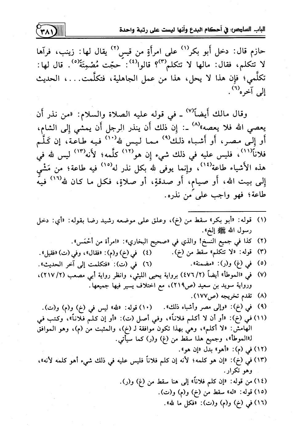 وَقَالَ مَالِكٌ أَيضاً (¬7) ـ فِي قَوْلِهِ عَلَيْهِ الصَّلَاةُ وَالسَّلَامُ: "مِنْ نَذَرَ أَن يَعْصِيَ اللَّهَ فَلَا يَعْصِهِ" (¬8) ـ: إِن ذَلِكَ أَن يَنْذُرَ الرَّجُلُ أَن يمشي إِلى الشام، أَو إِلى مصر، أَو أَشباه ذلك (¬9) مما ليس لله (¬10) فيه طاعة، إن كَلَّم فُلَانًا (¬11)، فَلَيْسَ عَلَيْهِ فِي ذَلِكَ شَيْءٌ إِن هُوَ (¬12) كلَّمه؛ لأَنه (¬13) لَيْسَ لِلَّهِ فِي هَذِهِ الأَشياء طَاعَةٌ (¬14)، وإِنما يُوفِي لِلَّهِ بِكُلِّ نَذْرٍ له (¬15) فِيهِ طَاعَةٌ؛ مِنْ مَشْيٍ إِلى بَيْتِ اللَّهِ، أَو صيامٍ، أَو صدقةٍ، أَوْ صلاةٍ، فَكُلُّ ما كان لِلَّهِ (¬16) فِيهِ طَاعَةٌ؛ فَهُوَ وَاجِبٌ عَلَى مَنْ نذره.