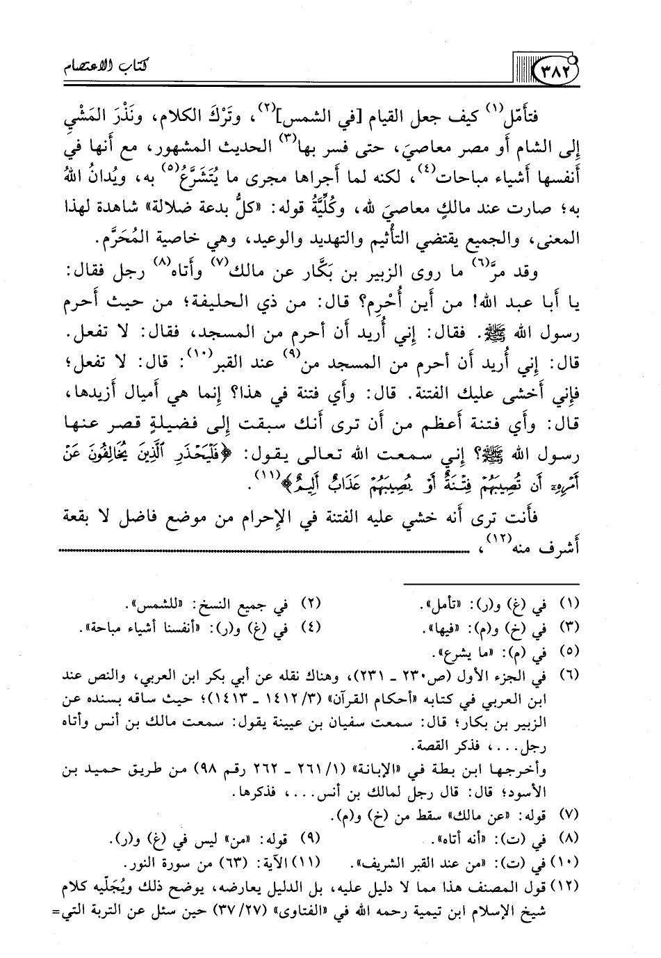 فتأَمّل (¬1) كَيْفَ جَعَلَ الْقِيَامَ [فِي الشَّمْسِ] (¬2)، وتَرْكَ الْكَلَامَ، ونَذْرَ المَشْيِ إِلى الشَّامِ أَو مِصْرَ معاصيَ، حتى فسر بها (¬3) الْحَدِيثَ الْمَشْهُورَ، مَعَ أَنها فِي أَنفسها أَشياء مُبَاحَاتٍ (¬4)، لَكِنَّهُ لَمَّا أَجراها مَجْرَى مَا يُتَشَرَّعُ (¬5) به، ويُدانُ اللهُ بِهِ؛ صَارَتْ عِنْدَ مالكٍ معاصيَ لِلَّهِ، وكُلِّيَّةُ قَوْلِهِ: "كلُّ بِدْعَةٍ ضَلَالَةٌ" شَاهِدَةٌ لِهَذَا الْمَعْنَى، وَالْجَمِيعُ يَقْتَضِي التأْثيم وَالتَّهْدِيدَ وَالْوَعِيدَ، وَهِيَ خَاصِّيَّةُ المُحَرَّم.