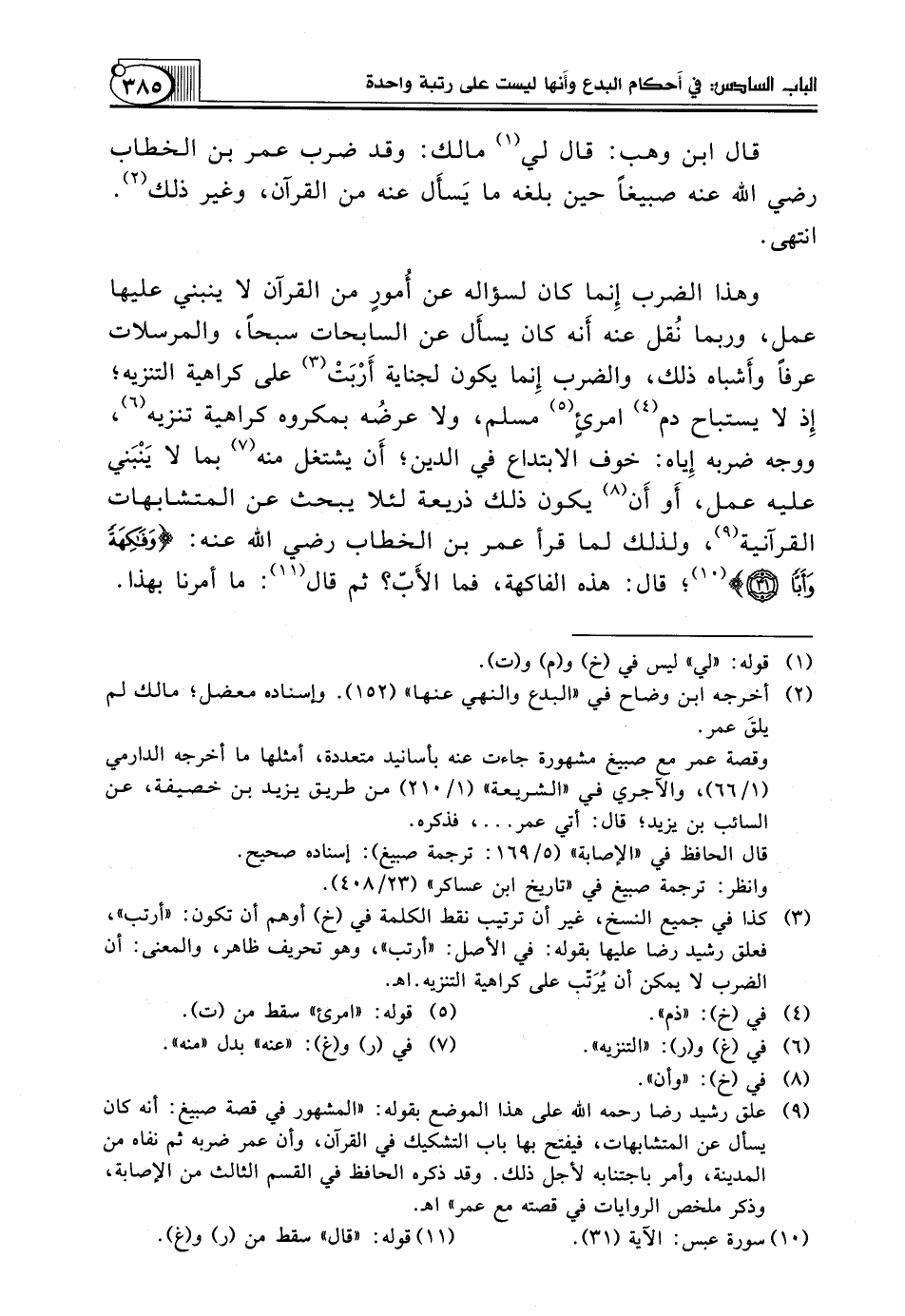 (¬9) علق رشيد رضا رحمه الله على هذا الموضع بقوله: "المشهور في قصة صبيغ: أنه كان يسأل عن المتشابهات، فيفتح بها باب التشكيك في القرآن، وأن عمر ضربه ثم نفاه من المدينة، وأمر باجتنابه لأجل ذلك. وقد ذكره الحافظ في القسم الثالث من الإصابة، وذكر ملخص الروايات في قصته مع عمر" اهـ.