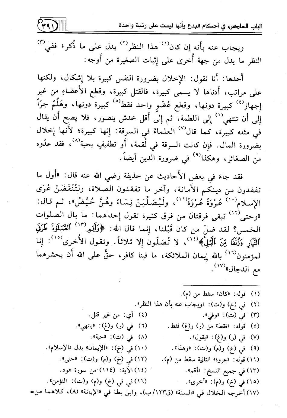 أَحدها: أَنا نَقُولُ: الإِخلال بِضَرُورَةِ النَّفْسِ كَبِيرَةٌ بِلَا إِشكال، وَلَكِنَّهَا عَلَى مَرَاتِبَ، أَدناها لَا يُسَمَّى كَبِيرَةً، فَالْقَتْلُ كَبِيرَةٌ، وَقَطْعُ الأَعضاءِ مِنْ غَيْرِ إِجهاز (¬4) كبيرة دونها، وقطع عُضْوٍ واحد فقط (¬5) كَبِيرَةٌ دُونَهَا، وهَلُمّ جَرَّا إِلى أَن تَنْتَهِيَ (¬6) إِلى اللَّطْمَةِ، ثُمَّ إِلى أَقل خَدْشٍ يُتَصَوَّرُ، فَلَا يَصِحُّ أَن يُقَالَ فِي مَثَلِهِ كَبِيرَةٌ، كَمَا قَالَ (¬7) العلماءُ فِي السَّرِقَةِ: إِنها كَبِيرَةٌ؛ لأَنها إِخلال بِضَرُورَةِ الْمَالِ. فإِن كَانَتِ السَّرِقَةُ فِي لُقمة، أَو تطفيفٍ بِحَبَّةٍ (¬8)، فَقَدْ عَدُّوهُ من الصغائر، وهكذا (¬9) فِي ضَرُورَةِ الدِّينِ أَيْضًا.