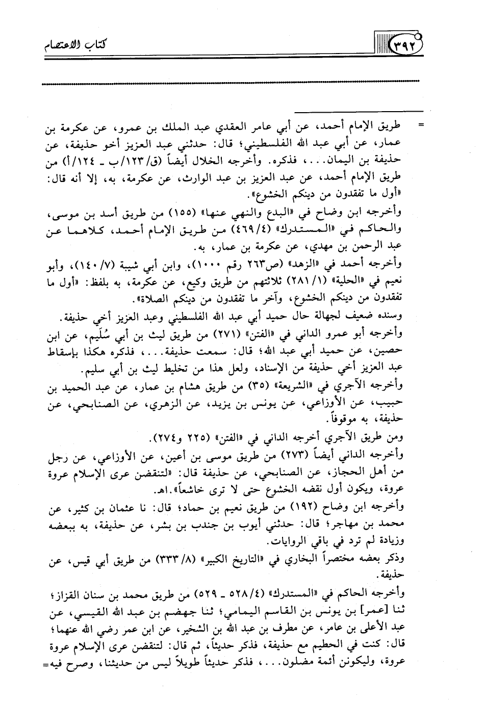 وأخرجه الداني أيضاً (273) من طريق موسى بن أعين، عن الأوزاعي، عن رجل من أهل الحجاز، عن الصنابحي، عن حذيفة قال: "لتنقضن عرى الإسلام عروة عروة، ويكون أول نقضه الخشوع حتى لا ترى خاشعاً".اهـ.