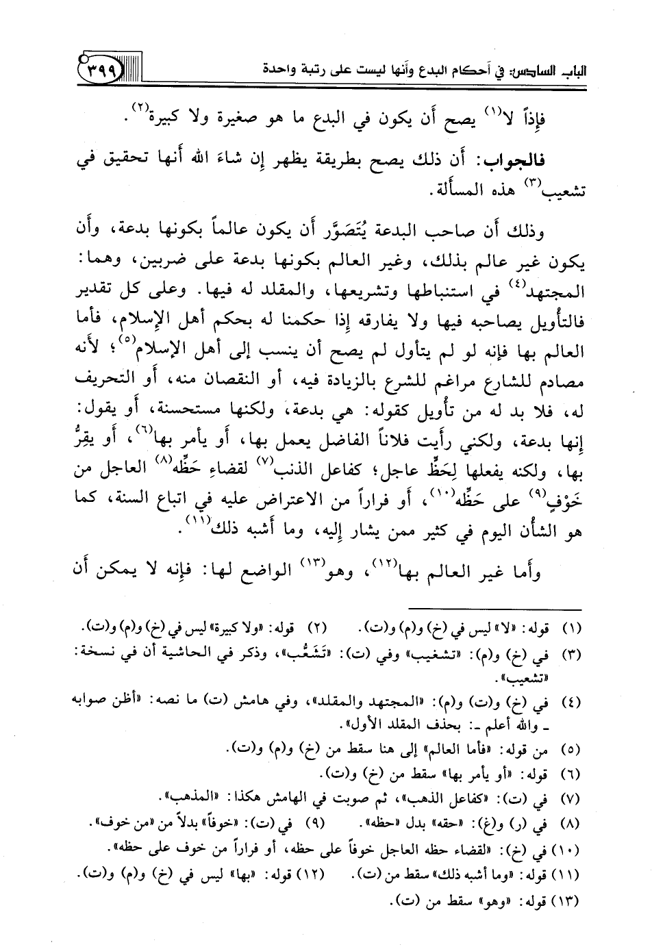 وَذَلِكَ أَن صَاحِبَ الْبِدْعَةِ يُتَصَوَّر أَن يَكُونَ عَالِمًا بِكَوْنِهَا بِدْعَةً، وأَن يَكُونَ غَيْرَ عَالِمٍ بِذَلِكَ، وَغَيْرُ الْعَالِمِ بِكَوْنِهَا بِدْعَةً عَلَى ضَرْبَيْنِ، وَهُمَا: الْمُجْتَهِدُ (¬4) فِي اسْتِنْبَاطِهَا وَتَشْرِيعِهَا، وَالْمُقَلِّدُ لَهُ فِيهَا. وَعَلَى كُلِّ تَقْدِيرٍ فالتأْويل يُصَاحِبُهُ فِيهَا وَلَا يُفَارِقُهُ إِذا حَكَمْنَا لَهُ بحكم أهل الإِسلام، فأما العالم بها فإنه لو لم يتأول لم يصح أن ينسب إلى أَهْلِ الْإِسْلَامِ (¬5)، لأَنه مُصَادِمٌ لِلشَّارِعِ مُرَاغَمٌ لِلشَّرْعِ بِالزِّيَادَةِ فِيهِ، أَوِ النُّقْصَانِ مِنْهُ، أَو التَّحْرِيفِ لَهُ، فَلَا بُدَّ لَهُ مِنْ تأْويل كَقَوْلِهِ: هِيَ بِدْعَةٌ، وَلَكِنَّهَا مُسْتَحْسَنَةٌ، أَو يَقُولُ: إِنها بِدْعَةٌ، وَلَكِنِّي رأَيت فُلَانًا الْفَاضِلَ يَعْمَلُ بِهَا، أَو يأمر بِهَا (¬6)، أَو يقِرُّ بِهَا، وَلَكِنَّهُ يَفْعَلُهَا لِحَظٍّ عاجل؛ كفاعل الذنب (¬7) لقضاءِ حَظِّه (¬8) العاجل مِنْ خَوْفٍ (¬9) عَلَى حَظِّه (¬10)، أَو فِرَارًا مِنَ الِاعْتِرَاضِ عَلَيْهِ فِي اتِّبَاعِ السُّنَّةِ، كَمَا هُوَ الشأْن الْيَوْمَ فِي كَثِيرٍ مِمَّنْ يُشَارُ إِليه، وما أَشبه ذلك (¬11).