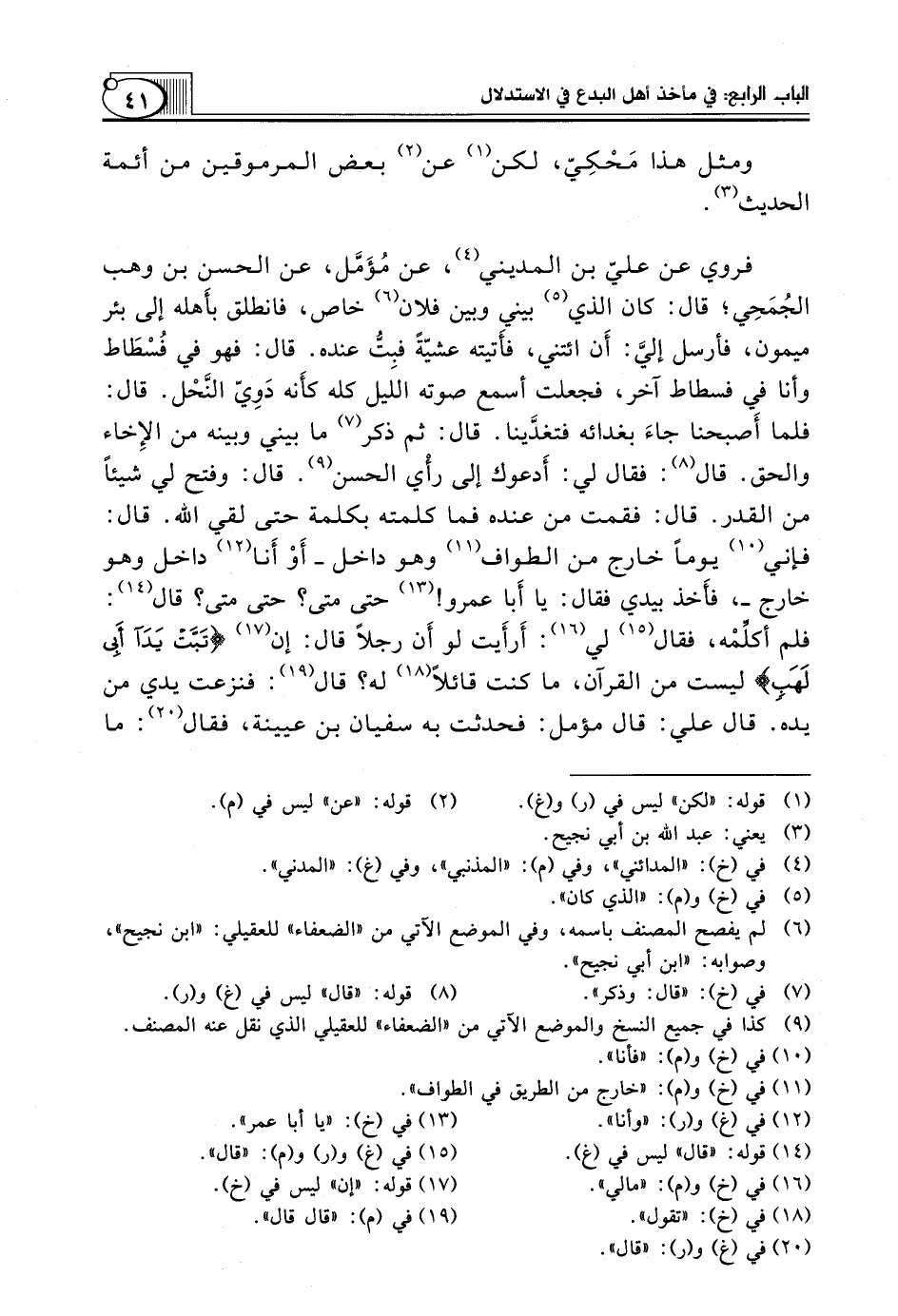 فروي عن عليّ بن المديني (¬4)، عن مُؤَمَّل، عن الحسن بن وهب الجُمَحِي؛ قال: كان الذي (¬5) بَيْنِي وَبَيْنَ فُلَانٍ (¬6) خَاصٌّ، فَانْطَلَقَ بأَهله إِلَى بِئْرِ مَيْمُونٍ، فَأَرْسَلَ إليَّ: أَن ائْتِنِي، فأَتيته عَشِيَّةً فبِتُّ عِنْدَهُ. قَالَ: فَهُوَ فِي فُسْطَاط وَأَنَا فِي فُسْطَاطٍ آخَرَ، فَجَعَلْتُ أَسْمَعُ صَوْتَهُ اللَّيْلَ كُلَّهُ كأَنه دَوِيّ النَّحْل. قَالَ: فَلَمَّا أَصبحنا جاءَ بِغَدَائِهِ فتغدَّينا. قَالَ: ثُمَّ ذَكَرَ (¬7) مَا بَيْنِي وَبَيْنَهُ مِنَ الإِخاء وَالْحَقِّ. قَالَ (¬8): فَقَالَ لِي: أَدعوك إِلَى رأْي الْحَسَنِ (¬9). قَالَ: وَفَتَحَ لِي شَيْئًا مِنَ الْقَدَرِ. قَالَ: فَقُمْتُ مِنْ عِنْدِهِ فَمَا كَلَّمْتُهُ بِكَلِمَةٍ حَتَّى لَقِيَ الله. قال: فإني (¬10) يوماً خارج من الطَّوَافِ (¬11) وَهُوَ دَاخِلٌ ـ أَوْ أَنا (¬12) دَاخِلٌ وَهُوَ خارج ـ، فأَخذ بيدي فقال: يا أَبا عمرو! (¬13) حَتَّى مَتَى؟ حَتَّى مَتَى؟ قَالَ (¬14): فَلَمْ أكلِّمْه، فقال (¬15) لِي (¬16): أَرأَيت لَوْ أَن رَجُلًا قَالَ: إِنَّ (¬17) {تَبَّتْ يَدَا أَبِي لَهَبٍ} لَيْسَتْ مِنَ الْقُرْآنِ، ما كنت قائلاً (¬18) لَهُ؟ قَالَ (¬19): فَنَزَعْتُ يَدِي مِنْ يَدِهِ. قَالَ عَلِيٌّ: قَالَ مُؤَمَّلٌ: فَحَدَّثْتُ بِهِ سُفْيَانَ بْنَ عيينة، فقال (¬20): ما
