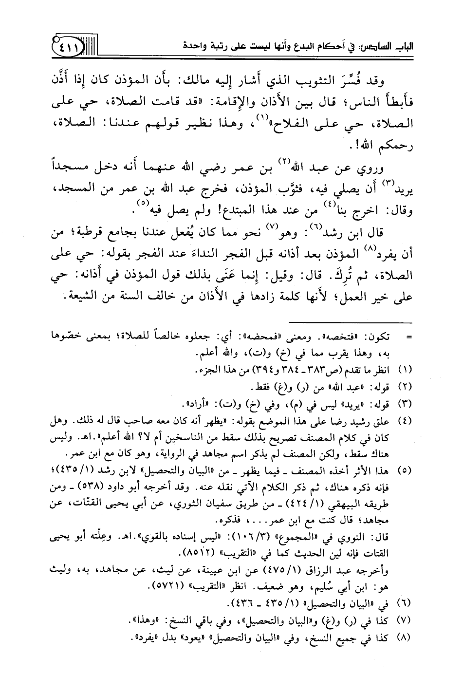 (¬5) هذا الأثر أخذه المصنف ـ فيما يظهر ـ من "البيان والتحصيل" لابن رشد (1/ 435)؛ فإنه ذكره هناك، ثم ذكر الكلام الآتي نقله عنه. وقد أخرجه أبو داود (538) ـ ومن طريقه البيهقي (1/ 424) ـ من طريق سفيان الثوري، عن أبي يحيى القتّات، عن مجاهد؛ قال كنت مع ابن عمر ... ، فذكره.