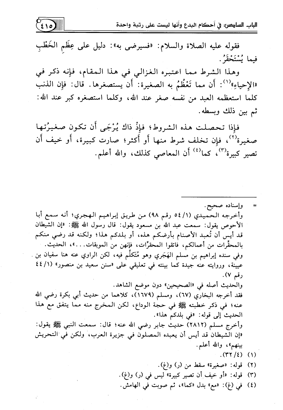 وَهَذَا الشَّرْطُ مِمَّا اعْتَبَرَهُ الْغَزَالِيُّ فِي هَذَا الْمَقَامِ، فإِنه ذَكَرَ فِي "الإِحياءِ" (¬1): أَن مِمَّا تَعْظُمُ بِهِ الصَّغِيرَةُ: أَن يَسْتَصْغِرَهَا. قَالَ: فإِن الذَّنْبَ كُلَّمَا اسْتَعْظَمَهُ الْعَبْدُ مِنْ نَفْسِهِ صَغُرَ عِنْدَ اللَّهِ، وَكُلَّمَا اسْتَصْغَرَهُ كَبُرَ عِنْدَ اللَّهِ: ثُمَّ بَيَّنَ ذَلِكَ وَبَسَطَهُ.