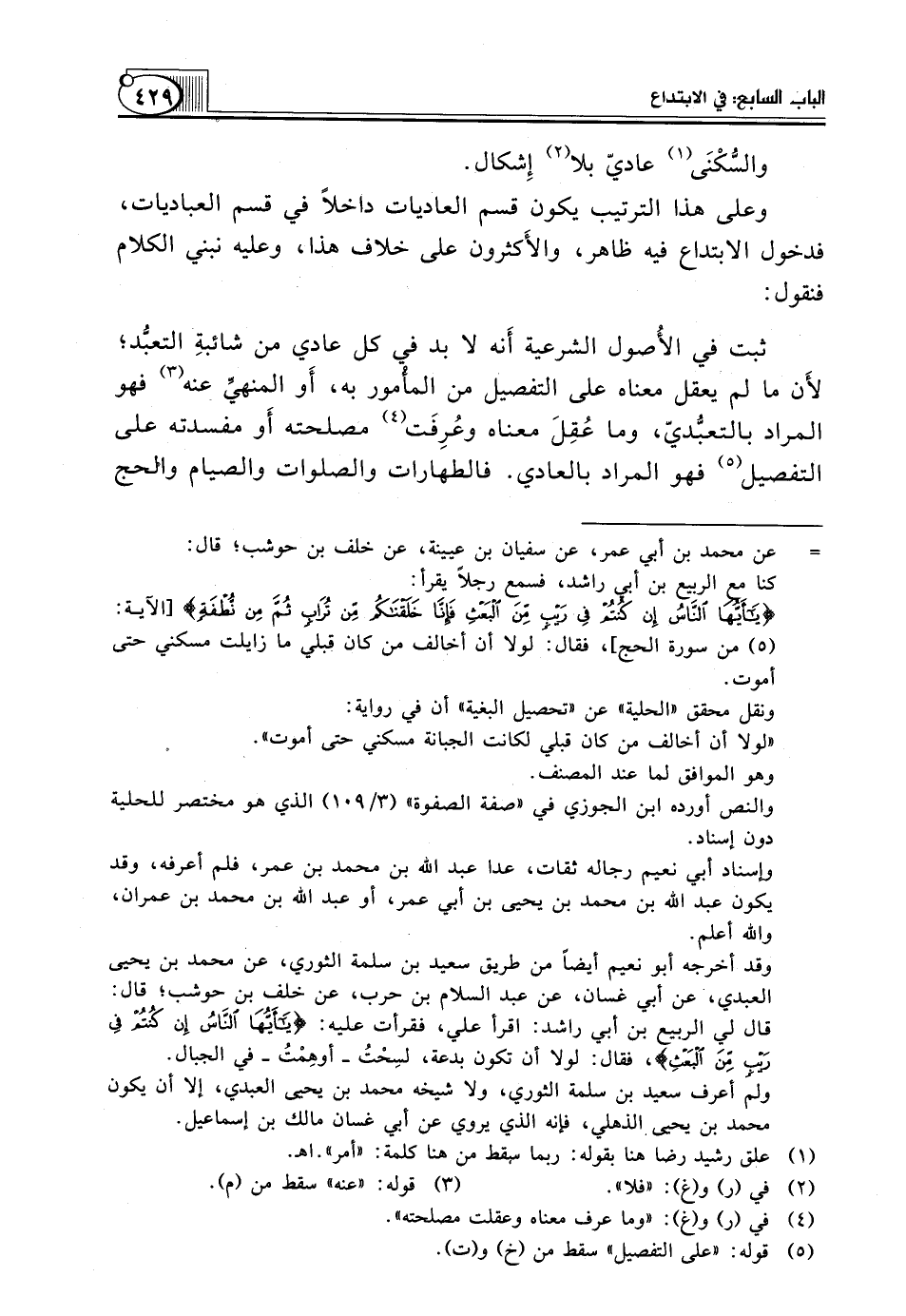 وقد أخرجه أبو نعيم أيضاً من طريق سعيد بن سلمة الثوري، عن محمد بن يحيى العبدي، عن أبي غسان، عن عبد السلام بن حرب، عن خلف بن حوشب؛ قال: قال لي الربيع بن أبي راشد: اقرأ علي، فقرأت عليه: {يَا أَيُّهَا النَّاسُ إِنْ كُنْتُمْ فِي رَيْبٍ مِنَ الْبَعْثِ}، فقال: لولا أن تكون بدعة، لسِحْتُ ـ أوهِمْتُ ـ في الجبال.