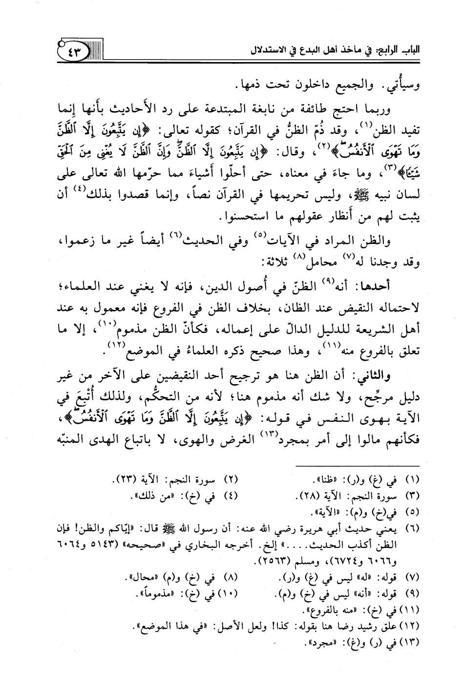وَرُبَّمَا احْتَجَّ طائفة من نابغة الْمُبْتَدَعَةِ عَلَى رَدِّ الأَحاديث بأَنها إِنما تُفِيدُ الظَّنَّ (¬1)، وَقَدْ ذُمّ الظنُّ فِي الْقُرْآنِ؛ كَقَوْلِهِ تَعَالَى: {إِنْ يَتَّبِعُونَ إِلاَّ الظَّنَّ وَمَا تَهْوَى الأَنْفُسُ} (¬2)، وَقَالَ: {إِنْ يَتَّبِعُونَ إِلاَّ الظَّنَّ وَإِنَّ الظَّنَّ لاَ يُغْنِي مِنَ الْحَقِّ شَيْئًا} (¬3)، وَمَا جاءَ فِي مَعْنَاهُ، حَتَّى أَحَلُّوا أَشياءَ مِمَّا حَرَمَهَا اللَّهُ تَعَالَى عَلَى لِسَانِ نَبِيِّهِ صَلَّى اللَّهُ عَلَيْهِ وَسَلَّمَ، وَلَيْسَ تَحْرِيمُهَا فِي القرآن نصاً، وإنما قصدوا بذلك (¬4) أَنْ يَثْبُتَ لَهُمْ مِنْ أَنظار عُقُولِهِمْ مَا استحسنوا.