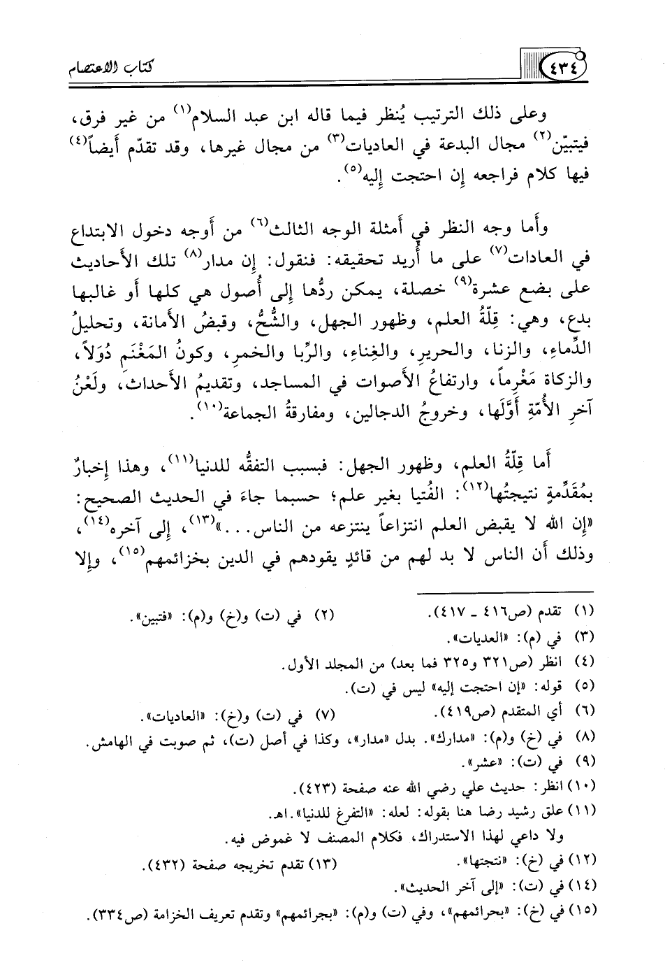 وأَما وَجْهُ النَّظَرِ فِي أَمثلة الْوَجْهِ الثَّالِثِ (¬6) مِنْ أَوجه دُخُولِ الِابْتِدَاعِ فِي الْعَادَاتِ (¬7) عَلَى مَا أُريد تَحْقِيقُهُ: فَنَقُولُ: إِن مدار (¬8) تِلْكَ الأَحاديث عَلَى بِضْعَ عَشْرَةَ (¬9) خَصْلَةً، يُمْكِنُ ردُّها إِلى أُصول هِيَ كُلُّهَا أَو غَالِبُهَا بِدَعٌ، وَهِيَ: قِلّةُ الْعِلْمِ، وَظُهُورُ الْجَهْلِ، والشُّحُّ، وقبضُ الأَمانة، وتحليلُ الدِّماءِ، وَالزِّنَا، والحريرِ، والغِناءِ، والرِّبا والخمرِ، وكونُ المَغْنَمِ دُوَلاً، وَالزَّكَاةُ مَغْرِماً، وارتفاعُ الأَصوات فِي الْمَسَاجِدِ، وتقديمُ الأَحداث، ولَعْنُ آخرِ الأُمّةِ أَوَّلَها، وخروجُ الدَّجَّالِينَ، ومفارقةُ الْجَمَاعَةِ (¬10).