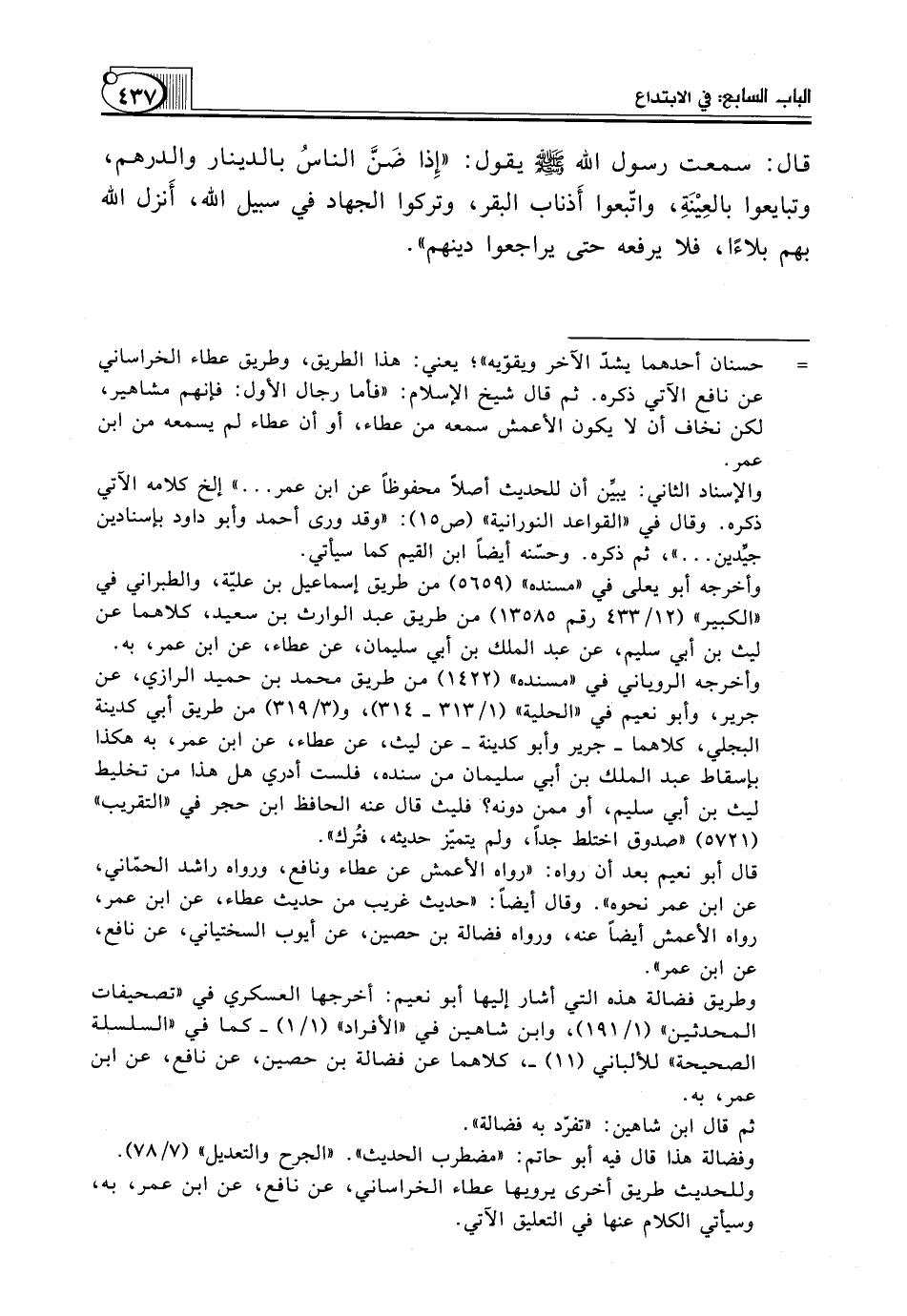 قَالَ: سَمِعْتُ رَسُولَ اللَّهِ صَلَّى اللَّهُ عَلَيْهِ وَسَلَّمَ يَقُولُ: "إِذا ضَنَّ الناسُ بِالدِّينَارِ وَالدِّرْهَمِ، وَتَبَايَعُوا بالعِيْنَةِ، وَاتَّبَعُوا أَذناب الْبَقَرِ، وَتَرَكُوا الْجِهَادَ في سبيل الله، أَنزل الله بهم بلاءًا، فلا يرفعه حتى يراجعوا دينهم".