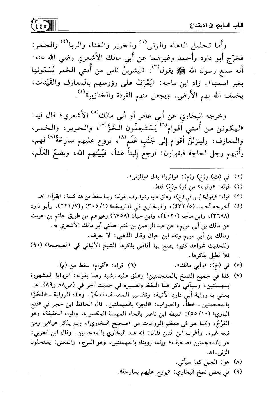 (¬7) كذا في جميع النسخ بالمعجمتين! وعلق عليه رشيد رضا بقوله: الرواية المشهورة بمهملتين، وسيأتي ذكر هذا اللفظ وتفسيره في حديث آخر في (ص88 و89).اهـ. يعني به رواية أبي داود الآتية، وتفسير المصنف للخَزّ. وهذه الرواية ـ "الخَزّ" بالمعجمتين ـ خطأ، والصواب: "الحِرَ" بالمهملتين. قال الحافظ ابن حجر في "فتح الباري" (10/ 55): ضبطه ابن ناصر بالحاء المهملة المكسورة، والراء الخفيفة، وهو الفَرْجُ، وكذا هو في معظم الروايات من "صحيح البخاري"، ولم يذكر عياض ومن تبعه غيره. وأغرب ابن التين فقال: إنه عند البخاري بالمعجمتين. وقال ابن العربي: هو بالمعجمتين تصحيف؛ وإنما رويناه بالمهملتين، وهو الفرج، والمعنى: يستحلون الزنى. اهـ.