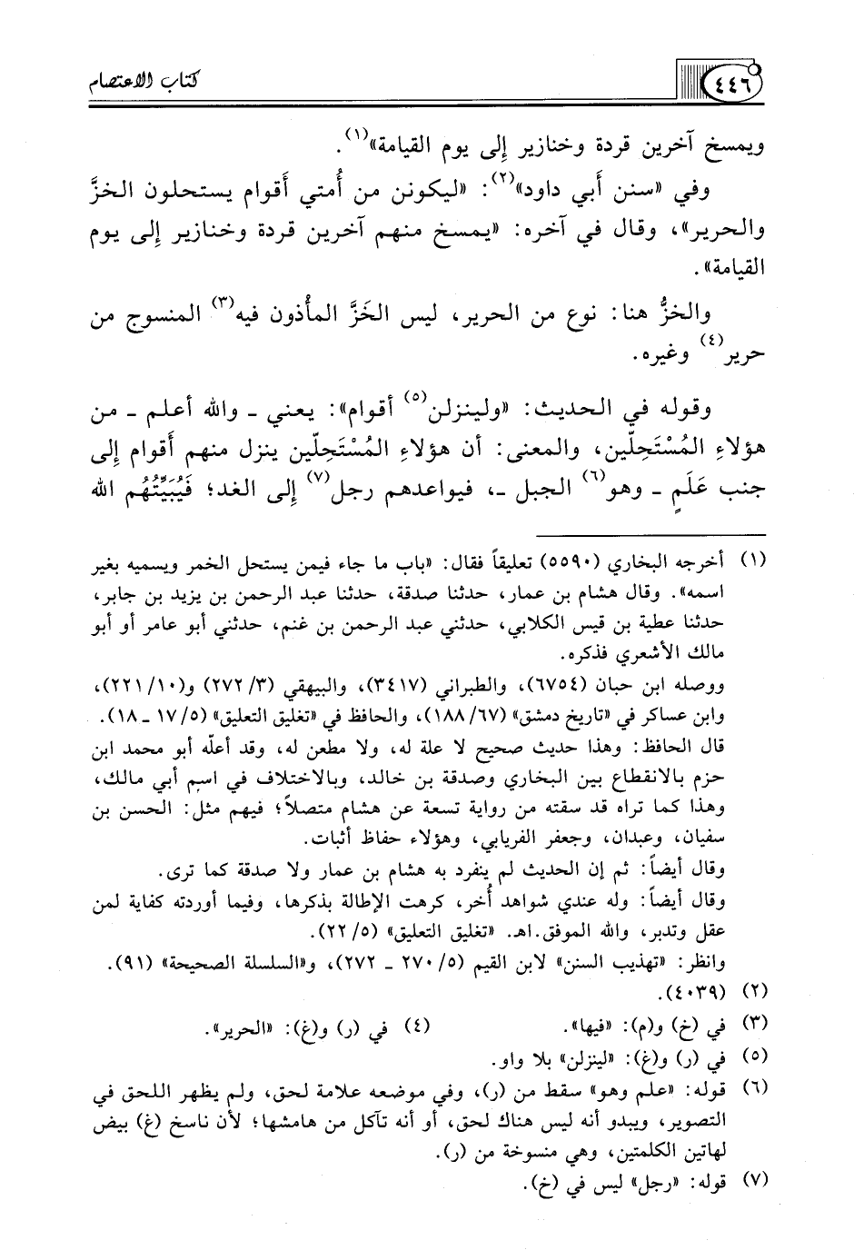 وَقَوْلُهُ فِي الْحَدِيثِ: "وَلِيَنْزِلَنَّ (¬5) أَقْوَامٌ": يَعْنِي ـ وَاللَّهُ أَعْلَمُ ـ مِنْ هؤلاءِ المُسْتَحِلّين، وَالْمَعْنَى: إِنَّ هؤلاءِ المُسْتَحِلّين يَنْزِلُ مِنْهُمْ أَقوام إِلى جَنْبِ عَلَمٍ ـ وَهُوَ (¬6) الْجَبَلُ ـ، فَيُوَاعِدُهُمْ رجل (¬7) إِلى الغد؛ فَيُبَيِّتُهُم الله