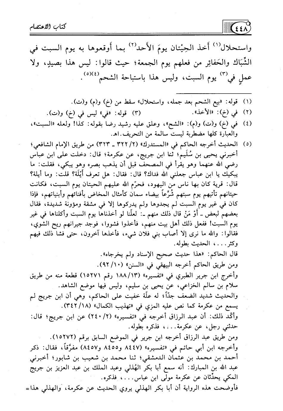 (¬5) الحديث أخرجه الحاكم في "المستدرك" (2/ 322 ـ 323) من طريق الإمام الشافعي؛ أخبرني يحيى بن سُلَيم؛ ثنا ابن جريج، عن عكرمة؛ قال: دخلت على ابن عباس رضي الله عنهما وهو يقرأ في المصحف قبل أن يذهب بصره وهو يبكي، فقلت: ما يبكيك يا ابن عباس جعلني الله فداك؟ قال: فقال: هل تعرف أَيْلَة؟ قلت: وما أيلة؟ قال: قرية كان بها ناس من اليهود، فحرّم الله عليهم الحيتان يوم السبت، فكانت حيتانهم تأتيهم يوم سبتهم شُرَّعاً بيضاء سمان كأمثال المخاض بأفنائهم وأبنياتهم، فإذا كان في غير يوم السبت لم يجدوها ولم يدركوها إلا في مشقة ومؤونة شديدة، فقال بعضهم لبعض ـ أَوْ مَنْ قال ذلك منهم ـ: لعلّنا لو أخذناها يوم السبت وأكلناها في غير يوم السبت! ففعل ذلك أهل بيت منهم، فأخذوا فشووا، فوجد جيرانهم ريح الشوي، فقالوا: والله ما نرى إلا أصاب بني فلان شيء، فأخذها آخرون، حتى فشا ذلك فيهم وكثر ... ، الحديث بطوله.